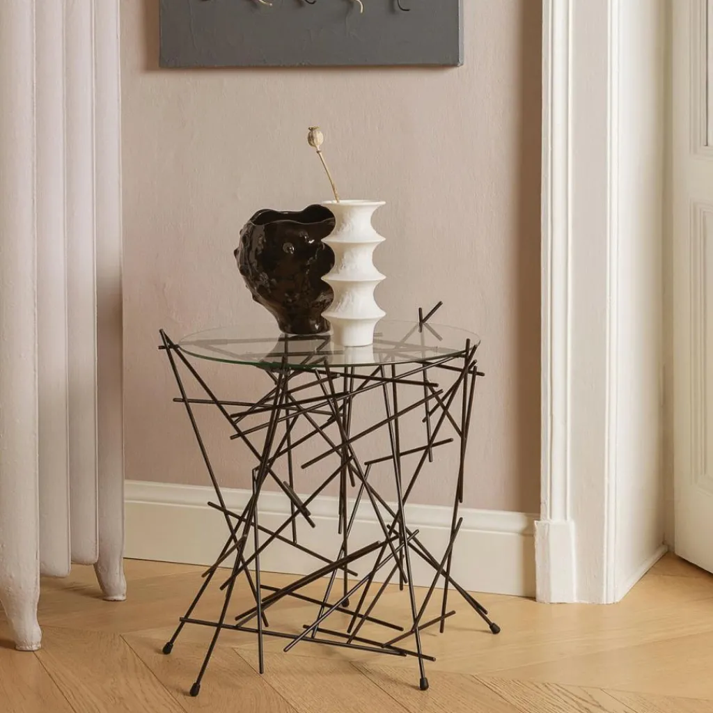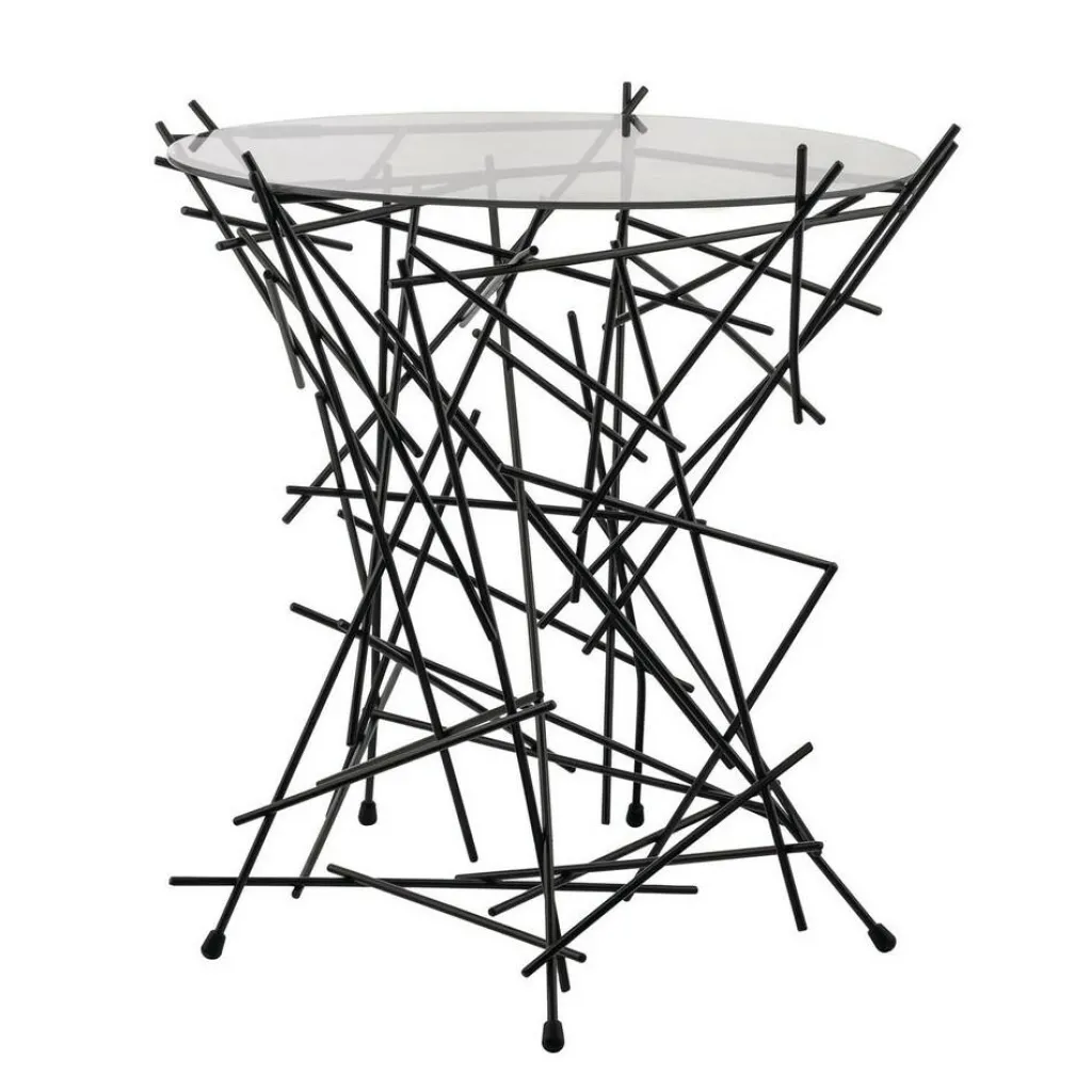 Der Name ist beim Blow Up Beistelltisch Programm. Seine zahlreichen Stäbe aus epoxidharzlackiertem Edelstahl lassen die Unterkonstruktion des Tisches wie explodiert aussehen. Fast scheint es, als wären die mal längeren und mal kürzeren Stäbe nach dem Zufallsprinzip angeordnet. Die auf den ersten Blick chaotisch wirkende Konstruktion erinnert an das pulsierende Leben in brasilianischen Großstädten wie São Paulo. In ihrer Summe formen sich die nur teilweise untereinander verbundenen Stäbe zu einer spannenden Sanduhrform, die als interessanter Kontrast zu ihrem sehr soliden Stahlmaterial luftig und leicht daherkommt. Die runde Tischplatte aus transparentem Glas wird von einigen Stäben eingefasst und ergänzt das luftige Design. Sie bietet mit einem Durchmesser von 45cm viel Platz für dekorative Accessoires oder Getränke und Snacks als Beistelltisch neben dem Sofa.