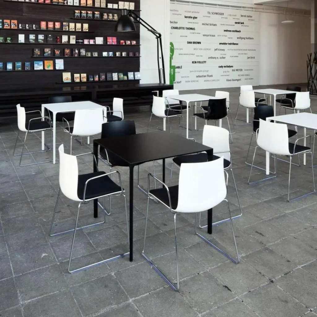 Catifa 46 0287 mit Kufe ist die neue Variante der bekannten Catifa-Form, die vom Designstudio Lievore, Altherr, Molina entworfen wurde. Catifa 46 ausgestattet mit einer nur 46 cm breiten Sitzfläche ist sowohl in einer Ausführung mit Kufengestell bei Stuhl und Hocker als auch mit vierbeinigem Gestell erhältlich. Alle Ausführungen sind stapelbar.