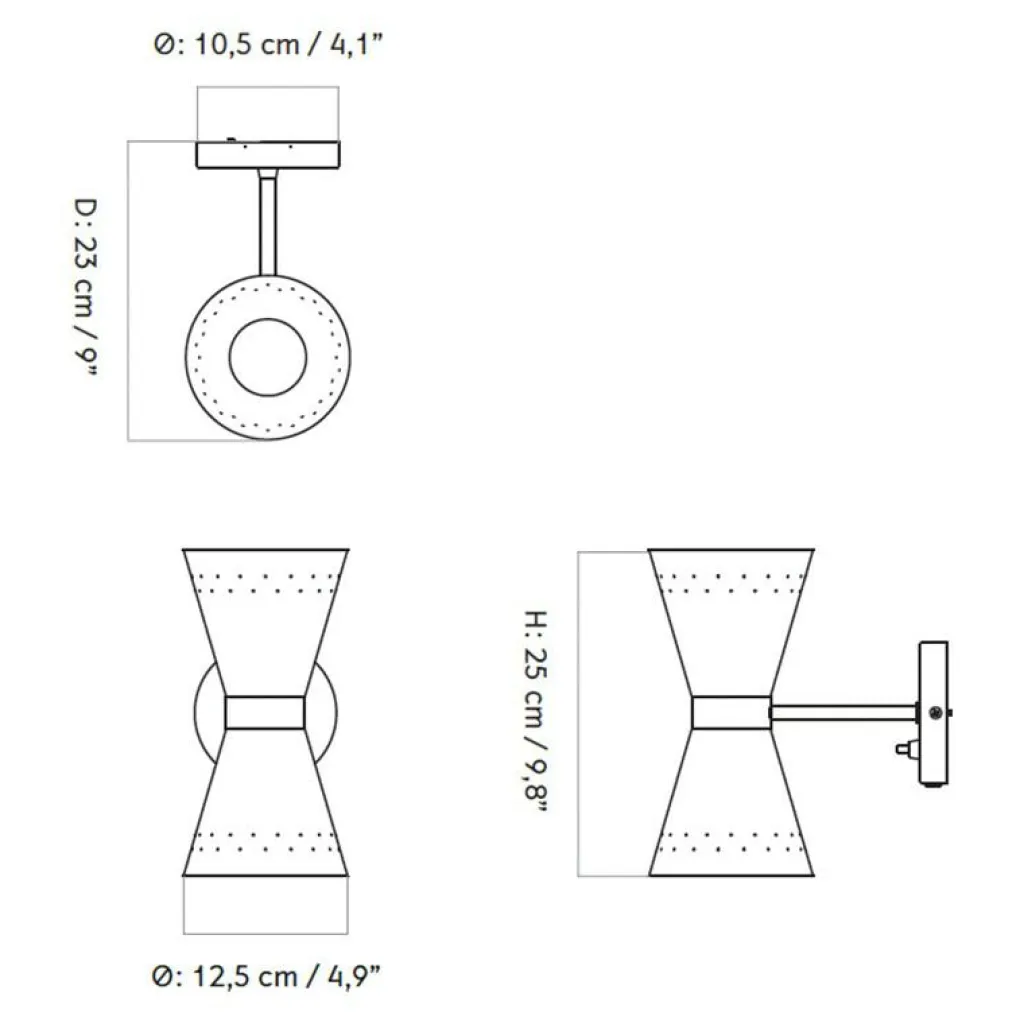 Zeitlose Eleganz verbreitet die Collector Wandleuchte.Das Design beschränkt sich auf wesentliche Elemente: Der Leuchtenschirm ist aus zwei konischen Elementen hergestellt, die sich an ihrer schmaleren Seite treffen. Ein wenig erinnert das Design an eine Sanduhr. Zwischen den beiden Teilen ist ein Ring aus Messing befestigt. Aus den beiden Leuchtenschirmen dringt Licht nach oben und nach unten. Somit zeichnet die Collector Wandleuchte interessante Muster auf die Wand, den Boden und an die Decke. Oben und unten sind in den Leuchtenschirm kleine Löcher eingearbeitet, die ebenfalls Licht durchlassen. Der Leuchtenschirm wird aus Aluminium hergestellt. Zur Befestigung an der Wand dient eine Rosette aus Stahl mit einem Durchmesser von 10,5cm. Daraus entspringt ein Stab, der zum Leuchtenschirm führt. Die Collector Wandleuchte wird mit einem Druckknopf an der Rosette ein- und ausgeschaltet.