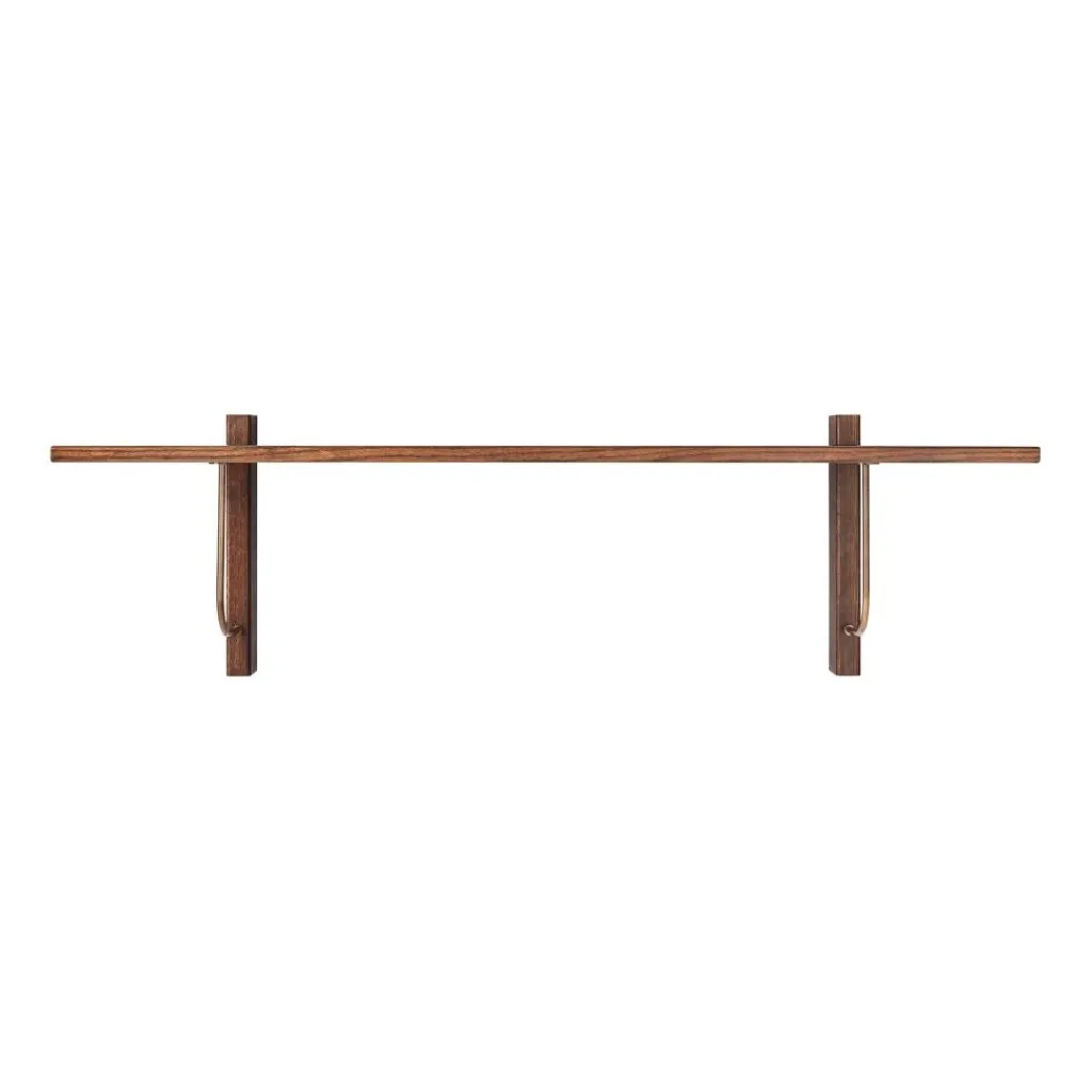 Der Name des Corbel Wandregals 100cm geht auf ursprüngliche Konsolen aus dem architektonischen Bereich zurück. Im rechten Winkel tragen die beiden Konsolen das Regalbrett aus dunkel gebeizter Eiche. Ein schönes Detail der Konsolen aus dem gleichen Material ist ihre Ergänzung um zwei abgerundete Stützen aus bronziertem Stahl. Das Regal misst 100cm Breite, 30cm Höhe und 29,5cm Tiefe bei einem Gewicht von 4,6kg. An den Rückseiten der beiden Konsolen wird das Corbel Wandregal 100cm an insgesamt vier Schienen gemäß der Wandbeschaffenheit unsichtbar an der Wand montiert. Die maximale Tragkraft beträgt 20kg.