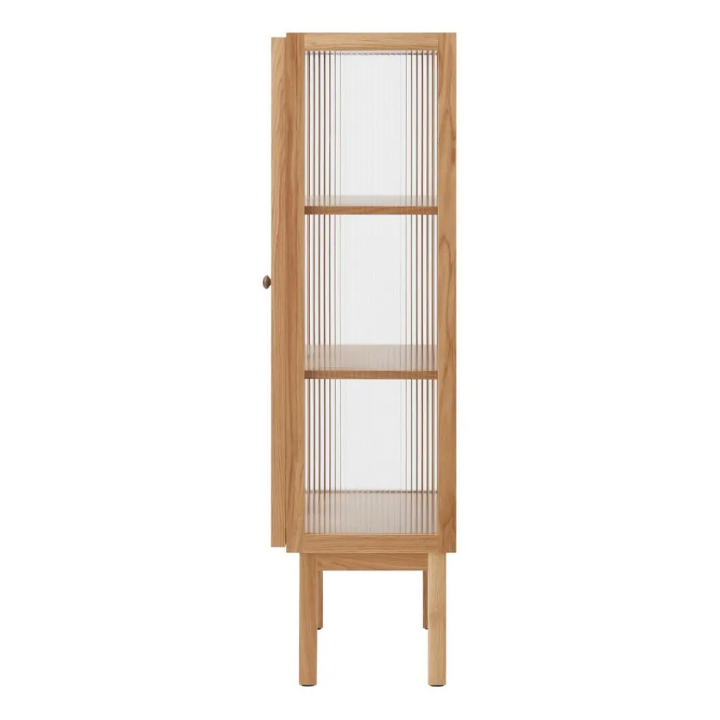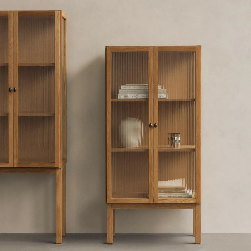 Die Curiosity Vitrine H 143 cm ist aus massivem Eichenholz nach traditioneller Tischlertechnik gefertigt. Sie steht auf einem Sockel mit vier rechteckigen Beinen mit Fußgleitern für den Schutz des Bodens. Als moderne Interpretation der Vitrine sind die beiden Schilfrohrglastüren ein besonderer Blickfang. Durch ihre geriffelte Struktur ist der Inhalt der Vitrine sanft verschwommen zu sehen. Hinter den Türen verbergen sich zwei Einlegeböden. Sie sind für das individuelle Einrichten der Kommode mit Büchern, Geschirr oder Deko in ihrer Höhe verstellbar. Ein schönes Detail sind die Scharniere und die beiden Griffe aus bronziertem Messing.