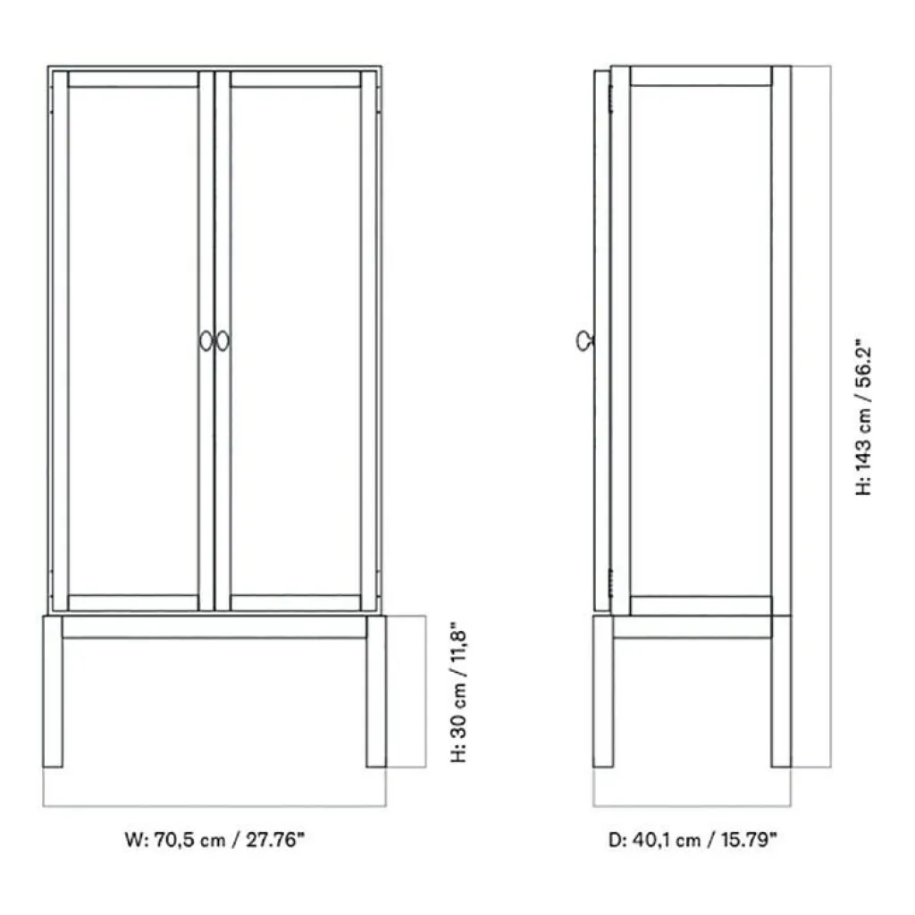 Die Vitrine misst in der Höhe 143cm inklusive der Beinhöhe von 30cm, in der Breite 70,5cm und in der Tiefe 40,1cm. Das Gewicht beträgt 71kg. Aufgrund des Schwenkbereichs der Türen wird für die Aufstellung der Vitrine insgesamt eine Tiefe von 71cm benötigt. Im gleichen Design ist aus der Serie eine Variante mit höheren Beinen erhältlich.