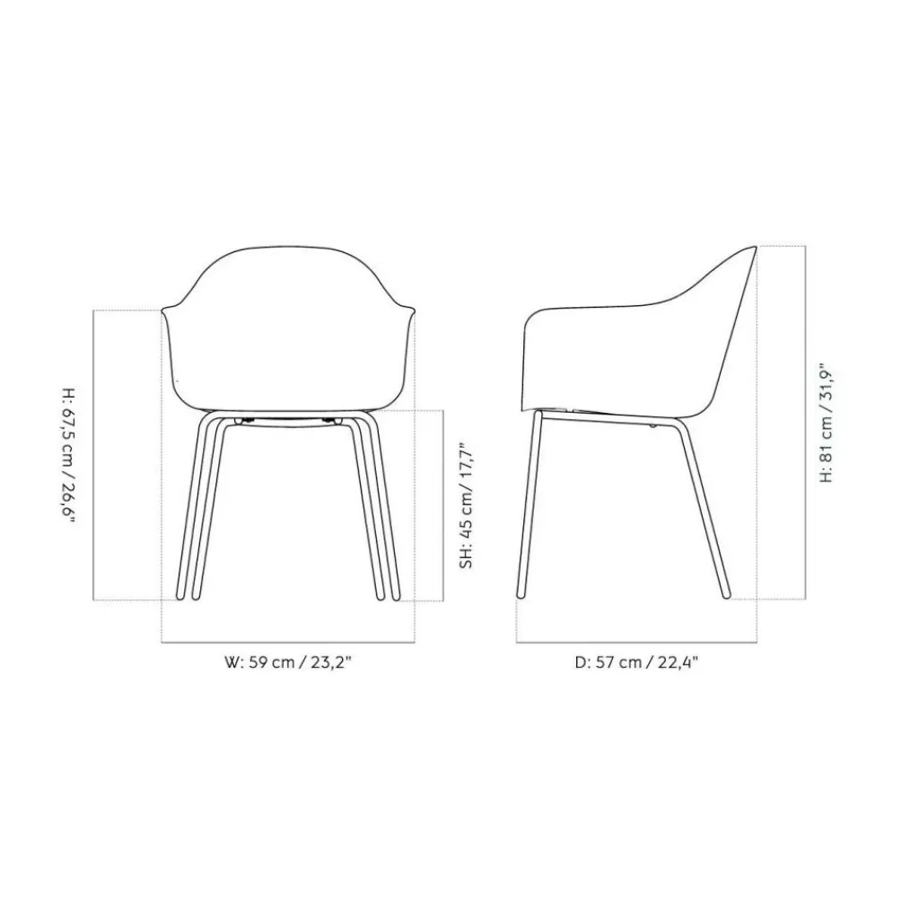 Der Harbour Armlehnstuhl Leder besitzt eine mit weichem Leder überzogene, durchgehend geformte Sitzschale, die auf einem Stahlgestell mit leicht nach außen stehenden, filigran geformten Füßen montiert ist. Die Sitzschale hat eine Breite von 59 cm und eine Tiefe von 57cm. Die Höhe des Stuhls beträgt 81cm und die an den Standard angepasste Sitzhöhe von 45cm ist optimal für längere Konferenzen oder ausgedehnte Gespräche geeignet.