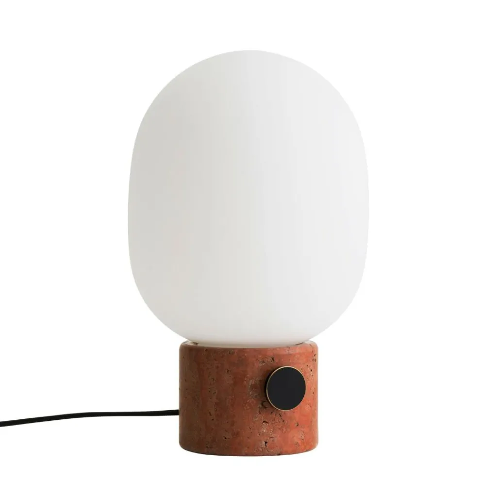 Die JWDA Tischleuchte Travertin vereint natürliche Eleganz mit funktionaler Beleuchtung. Der Sockel aus Travertin, einem charaktervollen Naturstein mit warmen Farbnuancen und einzigartiger Maserung, sorgt für eine stilvolle Basis. Die rote Färbung des hochwertigen Steinmaterials aus Verona ist ein stilvoller Kontrast zu dem sanft abgerundeten Schirm aus mundgeblasenem Opalglas. Dieser spendet ein angenehmes, diffuses Licht, das für eine behagliche Atmosphäre sorgt. Ein eleganter Dimmschalter aus bronziertem Messing ermöglicht eine stufenlose Anpassung der Helligkeit – ideal für verschiedene Beleuchtungssituationen. Ob als sanfte Lichtquelle auf dem Nachttisch, als dekoratives Element im Wohnzimmer oder als Akzent auf einer Konsole – die JWDA Tischleuchte Travertin fügt sich mühelos in unterschiedliche Wohnkonzepte ein. Mit einer Höhe von 32 cm und einem Durchmesser von 19 cm ist sie kompakt und vielseitig einsetzbar. Das dunkle und dezente Stoffkabel ist 200 cm lang. Die Leuchte wiegt 2 kg und wird mit einem G9 LED-Leuchtmittel geliefert. Da es sich bei Travertin um ein natürliches Material handelt, kann es zu leichten Farb- und Musterungsunterschieden kommen, die jede Leuchte zu einem wahren Unikat machen.