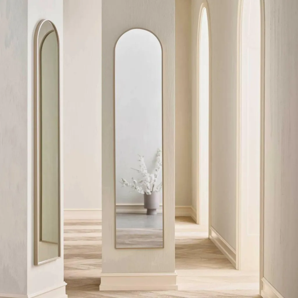 Die Ripple Kollektion zeichnet sich durch ihre markante, abgerundete Form aus, die an klassische Fensterbögen erinnert. Diese subtile Hommage an die romantische Architektur macht den Spiegel zu einem besonderen Designobjekt. Der schmale, pulverbeschichtete Aluminiumrahmen verleiht dem Spiegel eine filigrane Leichtigkeit, während die halbrunde Wölbung seinen Wiedererkennungswert unterstreicht. Mit einer Tiefe von nur 3 cm fügt sich der Ripple Spiegel 180x40cm harmonisch in verschiedene Wohnbereiche ein – sei es als stilvolles Element im Flur, als eleganter Akzent im Schlafzimmer oder als funktionales Designelement im Badezimmer. Der Spiegel ist für Feuchträume geeignet, sollte jedoch nicht direkt mit Wasser in Kontakt kommen. Eine aufgebrachte Sicherheitsfolie minimiert das Verletzungsrisiko bei Glasbruch. Zur Pflege genügt ein trockenes Tuch für den Rahmen und Glasreiniger für die Spiegelfläche. Der Ripple Spiegel 180x40cm verfügt über zwei Aufhängevorrichtungen an der Rückseite, die eine sichere Befestigung ermöglichen. Befestigungsmaterial ist nicht im Lieferumfang enthalten, da es individuell an die Wandbeschaffenheit angepasst werden sollte. Der Spiegel wiegt 10 kg.
