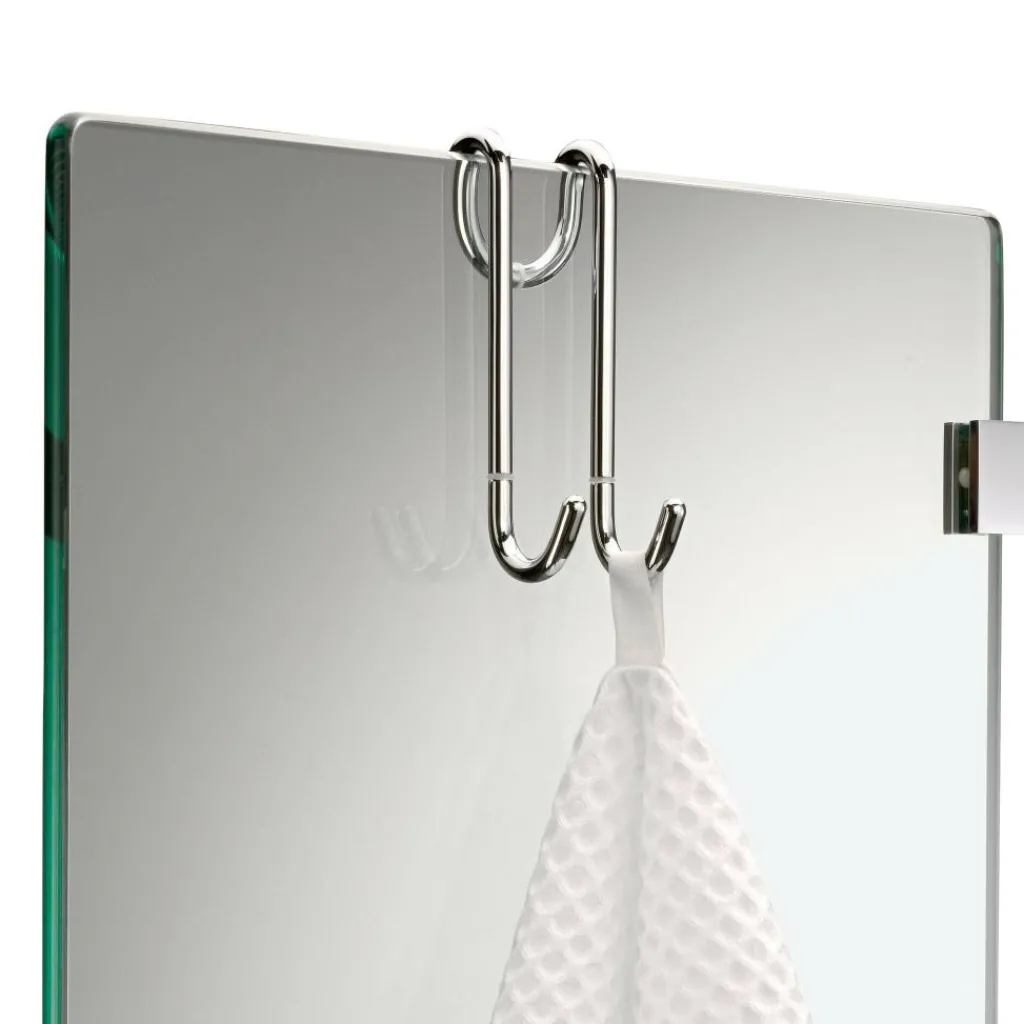 Der DH 1 Haken dient zum Einhängen an die Oberkante der Duschtrennwand und ermöglicht so den komfortablen Zugriff auf Handtuch und Bademantel. Da er nicht fix montiert, sondern nur eingehängt ist, kann er flexibel verwendet und immer wieder neu positioniert werden. Die Rundung an der Rückseite des Hakens greift die Form der vorderen Haken spielerisch auf und sorgt dabei für optimalen Halt. An der Vorderseite wirkt der DH 1 wie zwei einzelne Haken, deren robuste Endungen auch schwere Bademäntel verlässlich aufnehmen. Der 11 cm hohe Metallhaken DH 1 erfreut mit einer Oberfläche aus glänzendem Chrom und findet mit einer Breite von 4 cm und einer Tiefe von 3,5 cm leicht Platz.
