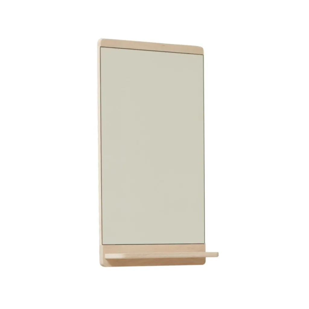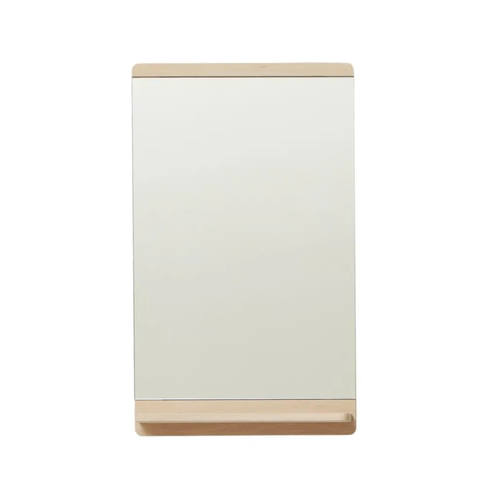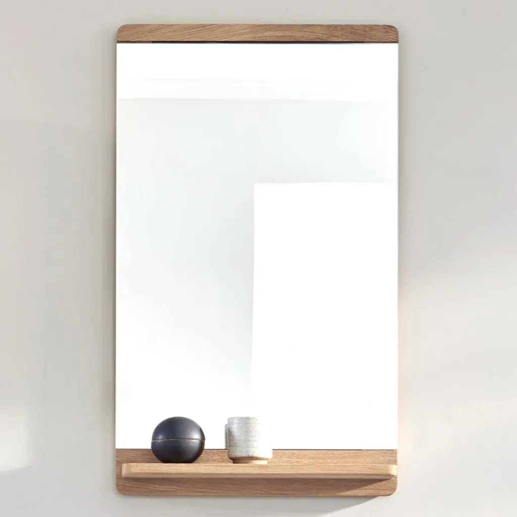 Beim Rim Wandspiegel handelt es sich um eine nachhaltige Wahl. Die Holzelemente stammen aus nachhaltiger Forstwirtschaft. Sie tragen daher das FSC®-Siegel. An der Ober- und Unterseite ist der Spiegel mit flachen Holzplatten eingerahmt. Sie verleihen dem Zimmer ein wohnliches Flair, da die natürliche Maserung zu sehen ist. Da an der Rückseite des Spiegels dickere Holzleisten angebracht sind, hebt sich der Rim Wandspiegel ein wenig von der Wand ab. So entsteht ein interessantes Spiel von Licht und Schatten. An der unteren Seite ist eine schmale Ablage angebracht. Hier sind Schminkutensilien, Schlüssel und andere Gegenstände griffbereit aufbewahrt.