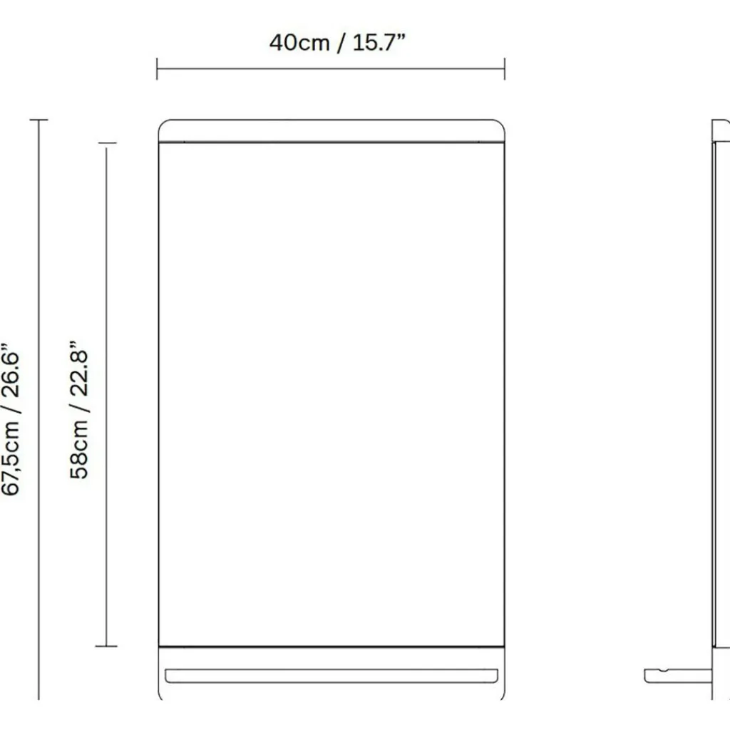 Der Rim Wandspiegel besteht aus hochwertigem massivem Eichenholz und Spiegelglas. Er ist 67,5 cm hoch. Die Breite beträgt 40 cm und die Tiefe 10 cm. Der Spiegel hat ein Gewicht von 4,5 kg und ist in mehreren Farbvarianten erhältlich.