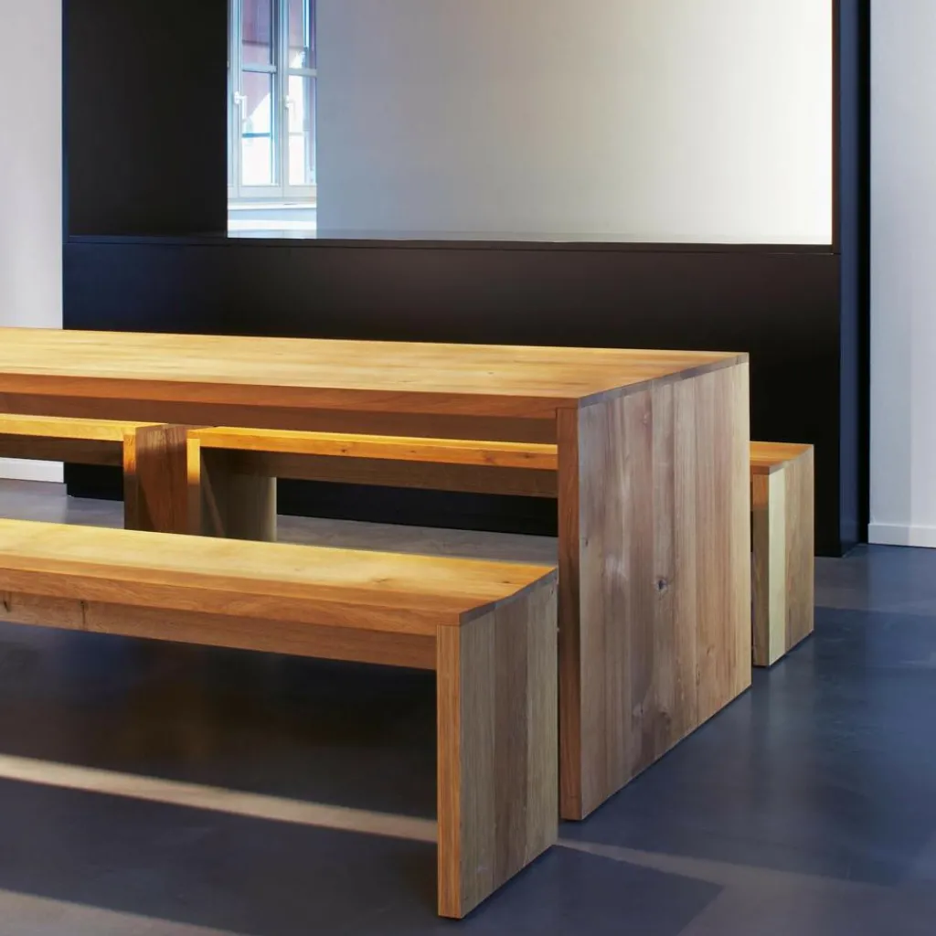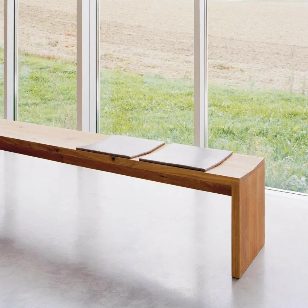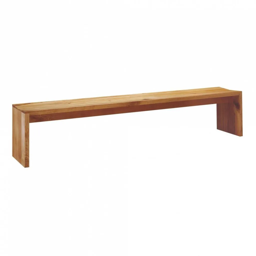 Auch die 40cm breite Calle Bank, die 2002 erstmals der Öffentlichkeit präsentiert wurde, besteht aus massivem Eichenholz mit einer spannenden Maserung. Diese setzt charaktervolle Akzente auf dem Sitzmöbel, das durch die einzigartige Zeichnung in jedem Fall ein echtes Unikat darstellt. Die schlichte Form der Sitzbank wird von einem 160cm langen Sitzbrett, einer stabilisierenden Zarge und zwei Seitenwangen verwirklicht. Da sich die Sitzfläche mittig verjüngt, genießt man auch bei längerem Sitzen optimalen Komfort. Die aus Holzbrettern mit der Stärke von 4cm gefertigte Calle Bank fügt sich optimal in bodenständige Umgebungen ein: Als Ergänzung zum schlichten Esszimmertisch macht sich die 47cm hohe Sitzbank ebenso gut wie als praktische Sitz- und Abstellfläche entlang einer der Wohnzimmerwände. Dank des geringen Pflegeaufwandes und der Langlebigkeit des Holzes eignet sich das Möbelstück auch für den gewerblichen Einsatz.