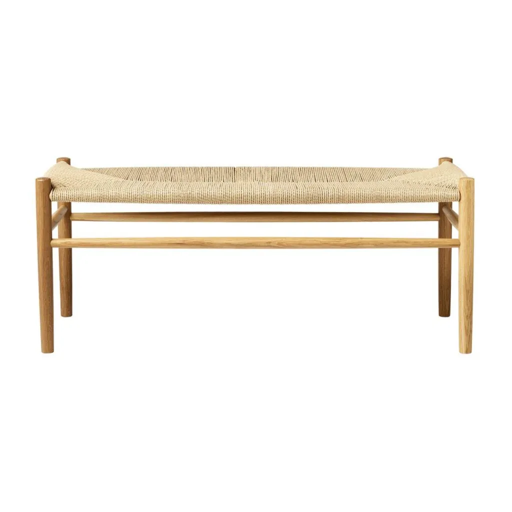 Ihre formschöne Sitzfläche mit höheren Seiten und einer tieferen Mitte macht die J83B Bank zu einem bequemen Sitzmöbel, das dank ihrer kunstvollen Bespannung aus Papiergarn für einen attraktiven Blickfang im Wohnraum sorgt. Das Gestell besteht ausschließlich aus Rundhölzern und verspricht nicht nur einen hohen Sitzkomfort, sondern auch Stabilität. Die geraden Beine und Verstrebungen werden nach außen hin schlanker, was das harmonische Design unterstreicht. Hergestellt aus FSC®-zertifiziertem Eichen- oder Buchenholz besticht die J83B Bank als nachhaltige Wahl. Für spontane Gäste im Wohnzimmer oder zum Ausruhen nach dem Heimkommen im Vorraum ist die J83B Bank ideal. Sie passt ebenso in den Warteraum einer Praxis oder ins Vorzimmer im Büro.