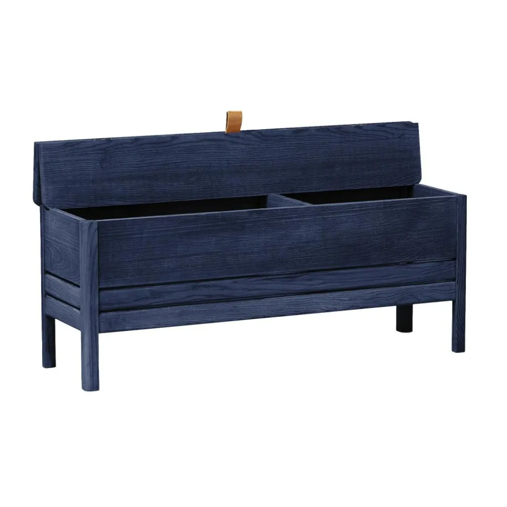 Die klassische Form einer Aufbewahrungstruhe wurde vom Herman Studio bei der Special Edition A Line Truhenbank 111cm in einer modernen und funktionalen Version neu interpretiert. Die Truhe ist aus massivem Eschenholz gearbeitet und gebeizt. Die abgerundeten Ecken des Deckels und die abgerundeten Kanten der Beine lockern das minimalistisch-rechteckige Design auf. Eine praktische Besonderheit ist die horizontale Faltmöglichkeit des Deckels, der mit einer Lasche aus naturgegerbtem Kernleder geöffnet wird und durch diese Konstruktion während der Nutzung nicht versehentlich zufallen kann. Im Inneren bieten zwei getrennte Fächer viel organisierten Stauraum für Schuhe im Flur, Bettwäsche im Schlafzimmer oder Spielzeug im Kinderzimmer.