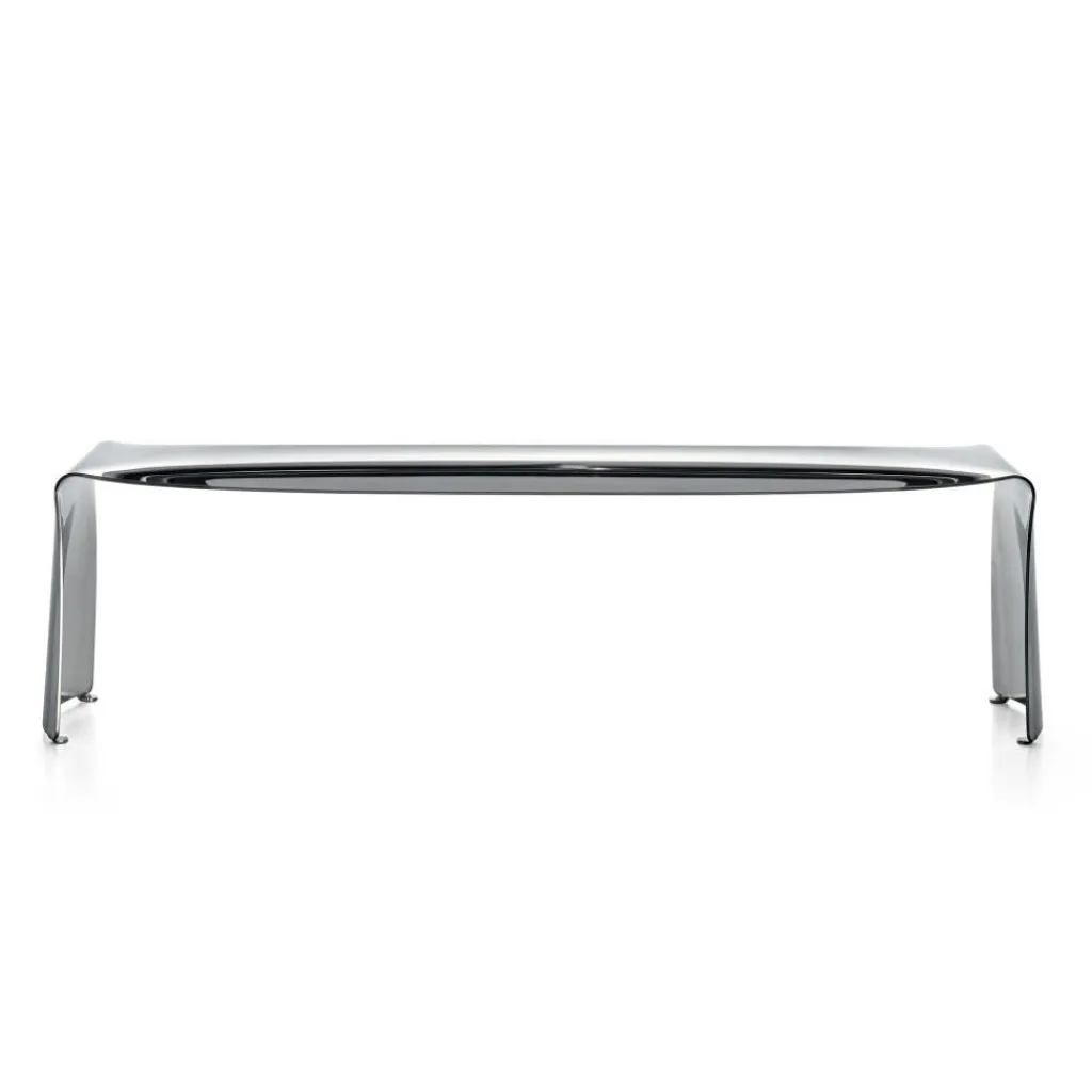 Der Originalentwurf des belgischen Designers geht auf das Jahr 2001 zurück. Die Special Edition Le Banc Bank 170x40x44cm ist als Besonderheit komplett aus einem Stück Aluminium von 6mm Stärke gefertigt. Elegante Biegungen zeichnen das Design der Bank aus. An den beiden Seiten dienen kleine, nach innen gebogene Halbkreise als Standfüße. Und auch die Kanten der Sitzfläche sind für einen bequemen Sitz nach innen gewölbt. Ihre hochglänzende Oberfläche verdankt sie einer handpolierten und handgebürsteten Behandlung.