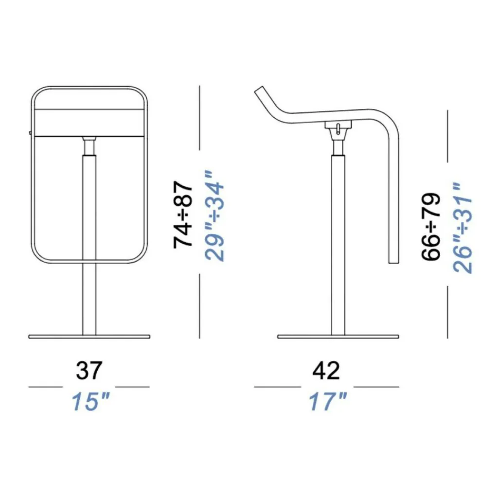 Eine Gasdruckfeder sorgt dafür, dass man den LEM S80 Barhocker Gestell Schwarz Sitzfläche Leder in der Höhe verstellen kann. Somit beträgt die Sitzhöhe zwischen 66 und 79 cm. Der schmale LEM S80 Barhocker Gestell Schwarz Sitzfläche Leder mit einer Breite von 37 cm passt auch in schmale Ecken. Die Tiefe beträgt 42 cm. Der schlichte Hocker ist 13,5 kg schwer.