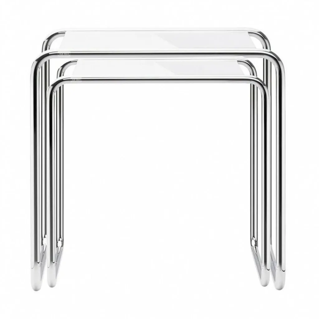 Der B 9 Beistelltisch 2er Set Glas wurde von Marcel Breuer für die Marke Thonet entworfen. Dabei handelt es sich um einen Klassiker, der während der Tätigkeit des Stardesigners am Bauhaus Dessau entstand. Damals experimentierte Breuer als erster Designer mit Stahlrohr und so entstand das charakteristische Gestell des B 9 Beistelltisches mit runden Ecken.
