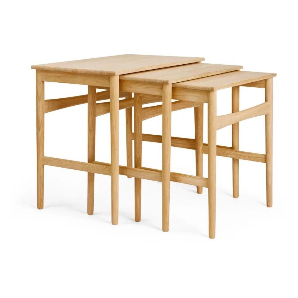 Die drei Tische des CH004 Nesting Tables 3er Sets sind aus wahlweise geölter oder geseifter Eiche mit aus Dänemark stammendem Holz aus FSC®-zertifizierter Herstellung gefertigt. Die jeweils vier leicht konisch zulaufenden Beine mit vier Zwischenstreben bilden einen interessanten Kontrast zur streng rechteckigen Tischplatte mit glatter Kante. Die Tische variieren in ihren Maßen und lassen sich kompakt auf die Maße des größten Tisches mit einer Länge von 52cm, einer Breite von 34cm und einer Höhe von 48cm zusammenschieben. Sie können komplett zusammen-, in Fächeroptik auseinandergeschoben oder einzeln als variationsreiche Beistelltische genutzt werden. Mit ihrem Gesamtgewicht von 7,3kg sind sie ganz nach Bedarf jederzeit flexibel arrangierbare Kleinmöbel im zeitlosen Design, die sich zu vielen Einrichtungsstilen harmonisch ergänzen.