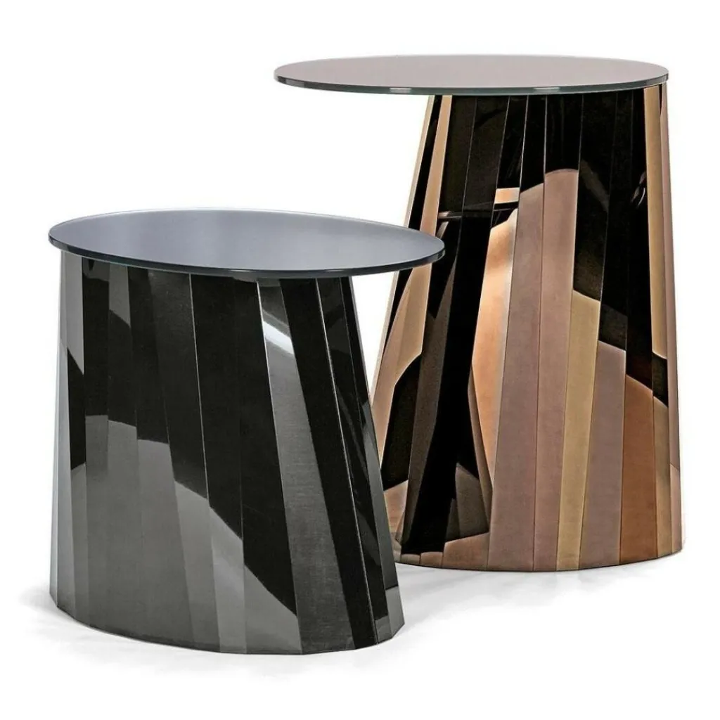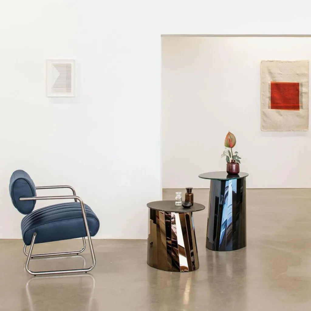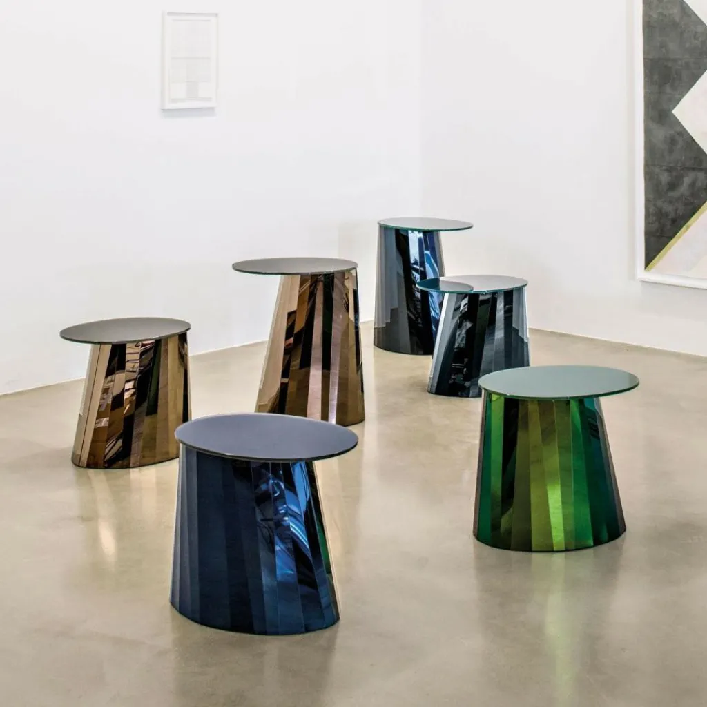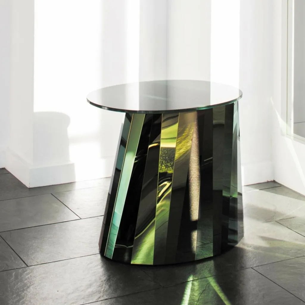 Der Pli Beistelltisch wurde von der Designerin Victoria Wilmotte für den Hersteller ClassiCon entworfen. Sein Stil passt perfekt zu einem extravaganten Einrichtungsstil, jedoch auch zu eleganten Ausstellungsräumen oder bei entsprechender Farbwahl auch zu einem rustikalen Stil. Sein auffälligstes Merkmal stellt das Farbspektrum dar, das bei Sonneneinwirkung entsteht. Das führt dazu, dass sich das außergewöhnliche Mobiliar unter anderem stilvoll in ein Uhren- oder Schmuckgeschäft einfügt. Des Weiteren sticht sein Design sofort ins Auge: Eine runde Tischplatte aus Kristallglas steht ein großes Stück über das Gestell hinaus, das sich als abgeschrägte Säule präsentiert. Die vom Hersteller gewählte Höhe lässt diesen Tisch zum Beistelltisch erster Wahl werden: 48 cm Höhe passen sich jeder Couch oder einem Bett an.