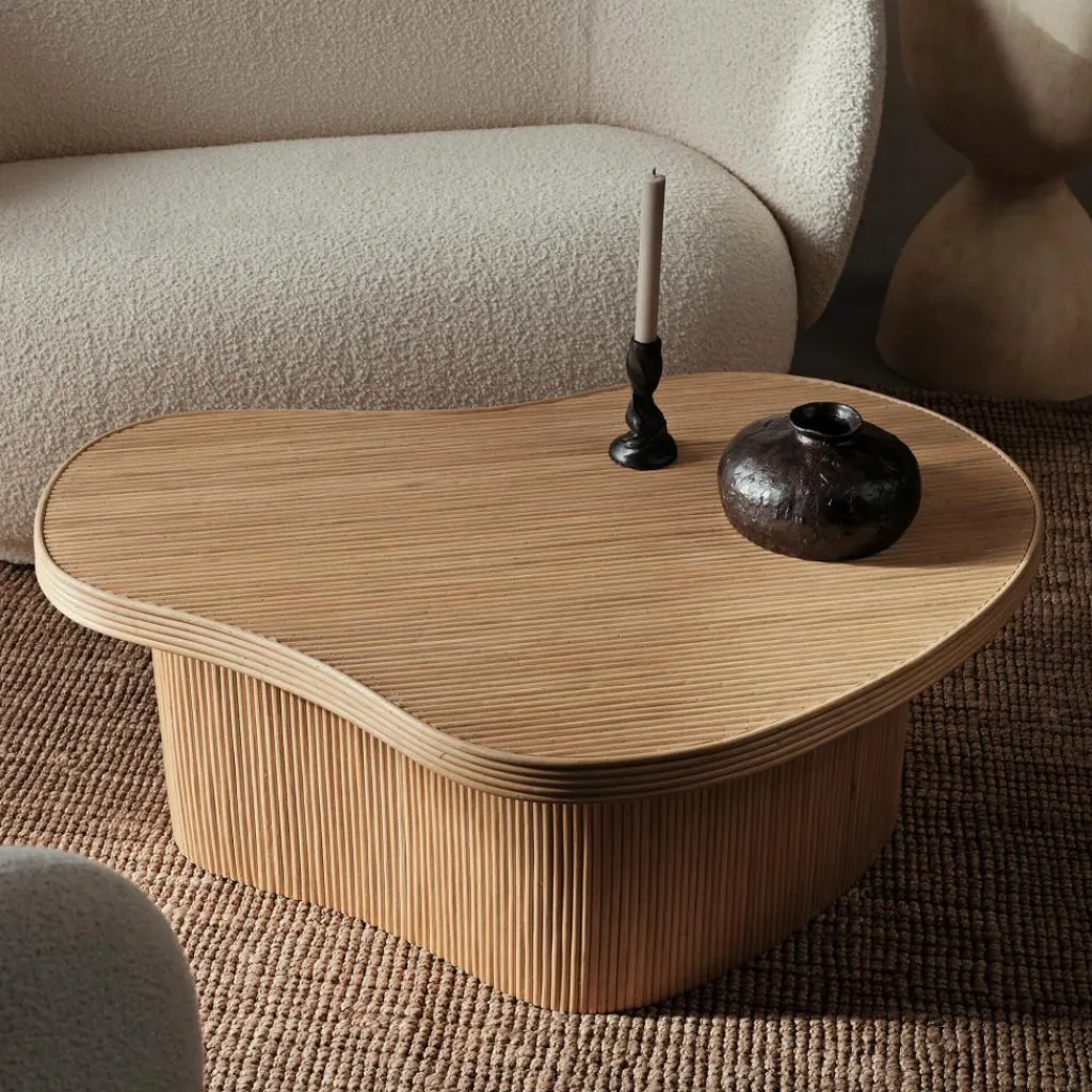 Durch seine sanft geschwungene Form und die auffallende Oberfläche zieht der Isola Couchtisch alle Blicke auf sich. Während das Gerüst aus MDF und Sperrholz gefertigt ist, besteht die handgefertigte Oberfläche komplett aus Rattan. Das gilt sowohl für die Tischplatte als auch für die geschlossenen Seitenwände des Modells, bei denen das Rattan in schmalen, länglichen Stäben angebracht sind. Mehrere, in vier Lagen übereinanderliegende gebogene Rattanstäbe bilden die Umrandung der Tischplatte, durch die die organische Ästhetik des Modells zusätzlich betont wird. Da jeder Couchtisch per Hand hergestellt wurde, können Abweichungen in Farbe und Musterung auftreten. Einen natürlichen Akzent bildet er aber in jeder Variante.