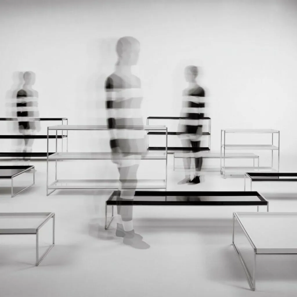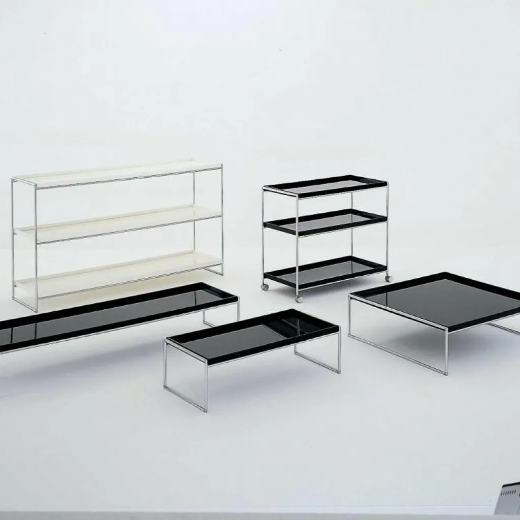Der Trays Couchtisch 80x80cm wurde von Piero Lissoni für das Herstellerhaus Kartell entworfen. Die konstruktive Entwurfsidee besteht in der Abwandlung von kleinen Tischen und Regalsystemen, deren Platten in Design und Ausführungen an lackierte japanische Tabletts erinnern. Der Gesamteindruck der Kollektion vermittelt eine Idee von Leichtigkeit und Eleganz, ohne dabei Abstriche bei der Stabilität und Widerstandsfähigkeit machen zu müssen. Die Tischplatten werden entweder in weißer oder schwarzer Ausführung geliefert, das Gestell besteht aus verchromtem Stahl.