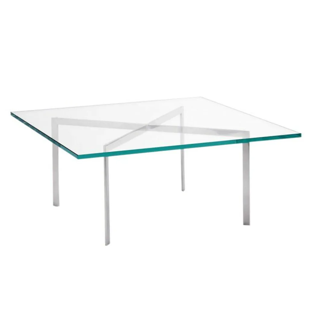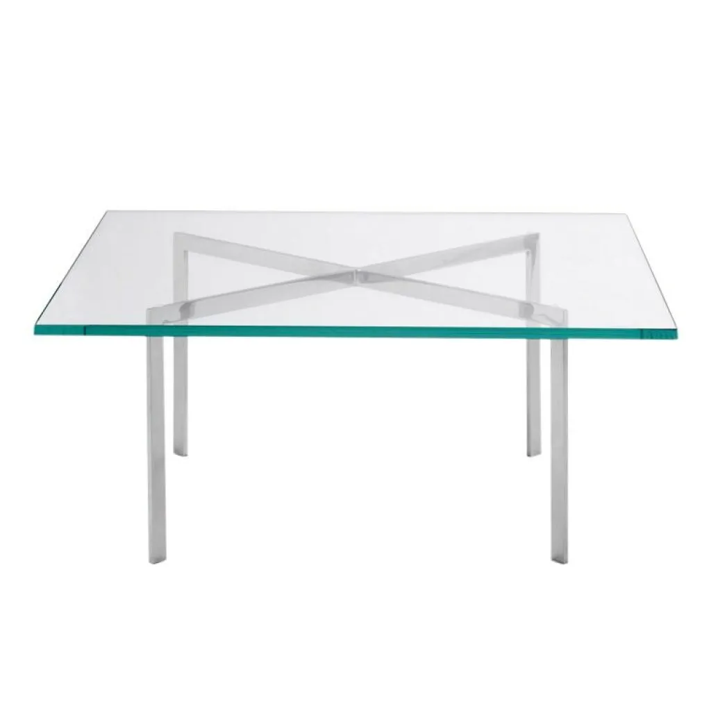 Das Gestellt des Barcelona® Couchtisches besteht aus glänzend verchromtem Flachstahl, die Tischplatte ist aus 15 mm dickem Kristallglas gefertigt, das dem Barcelona® Tisch seine filigrane Anmutung und gewisse Leichtigkeit verleiht.