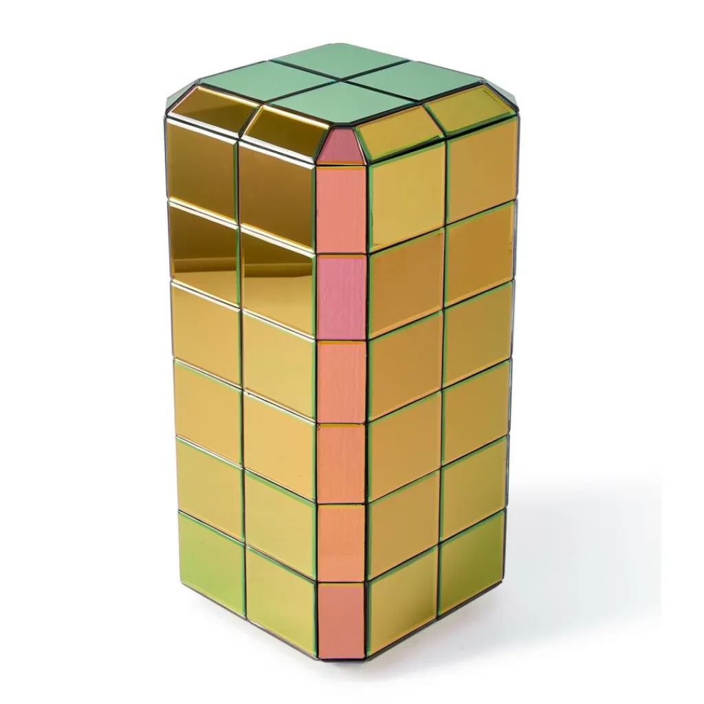 Geformt ist der Pillar Pixel Beistelltisch als Quader. Zum auffälligen Hingucker wird er dank der gläsernen Seitenflächen. Sie sind mit gleich großen, quadratischen Spiegelplatten getäfelt, die die Abmessungen des extravaganten Tischchens vorgeben und zudem dank ihrer changierenden Farbtöne an überdimensionale Bildpunkte erinnern. Optische Sprünge im Spiegelbild erzeugen die abgeschrägten Kanten mit ihren rechteckig oder trapezförmig zugeschnittenen Glasplatten. Der Pillar Pixel Beistelltisch ist ein schillerndes Designstück, das den Raum aufpeppt und ihm mit seinen Spiegelflächen eine neue Dimension verleiht. Er eignet sich zum Ablegen der Lektüre in einer Leseecke, zum Abstellen von Drinks neben dem Sofa oder zum Präsentieren von Vasen oder anderen Designgegenständen. Besonders eindrucksvoll wirken seine Glasflächen in lichtdurchfluteten Räumen oder zwischen Pflanzen im Wintergarten. Aber auch in einer flippigen Bar, in einer Lounge oder der Lobby eines stylischen Designhotels macht sich der Pillar Pixel Beistelltisch gut.