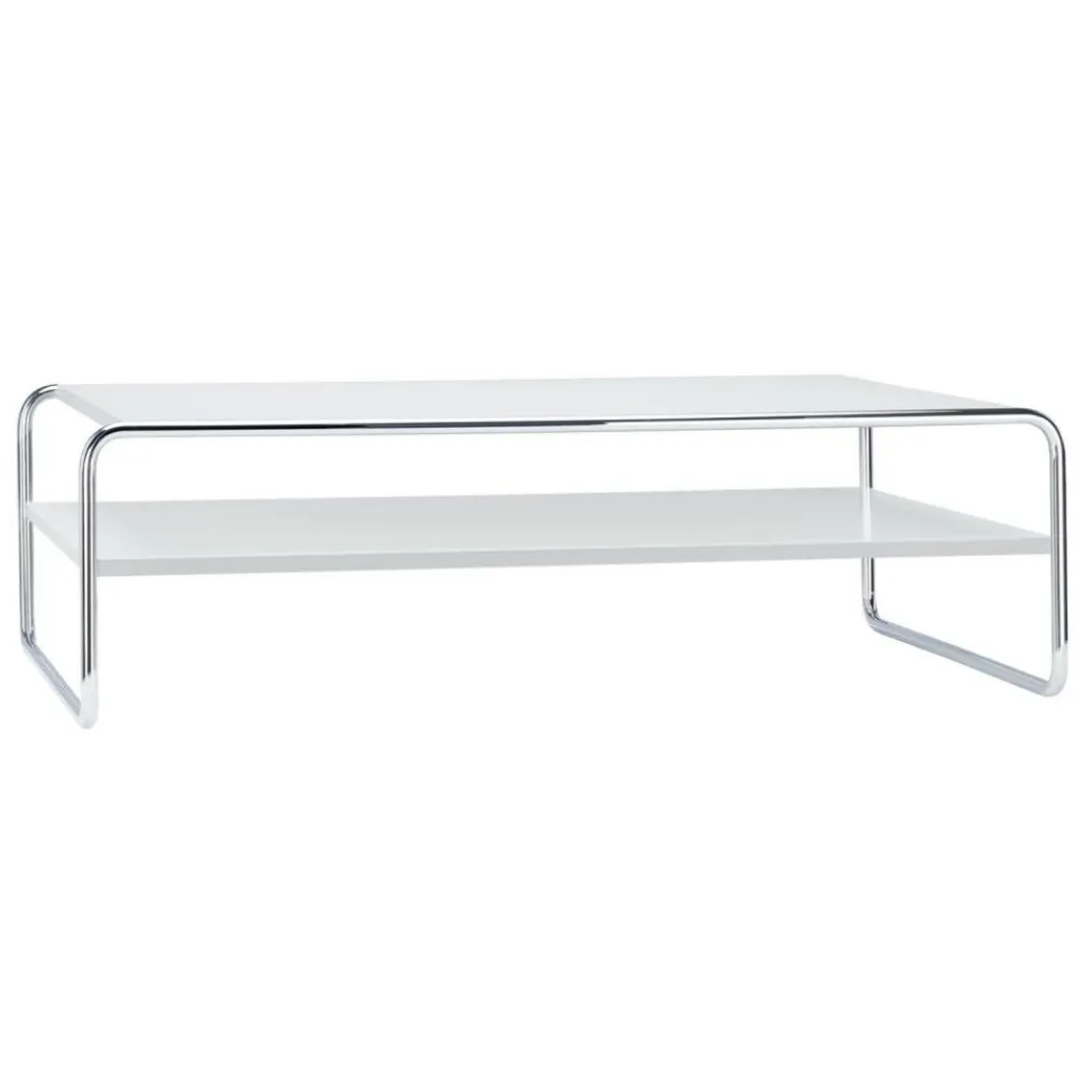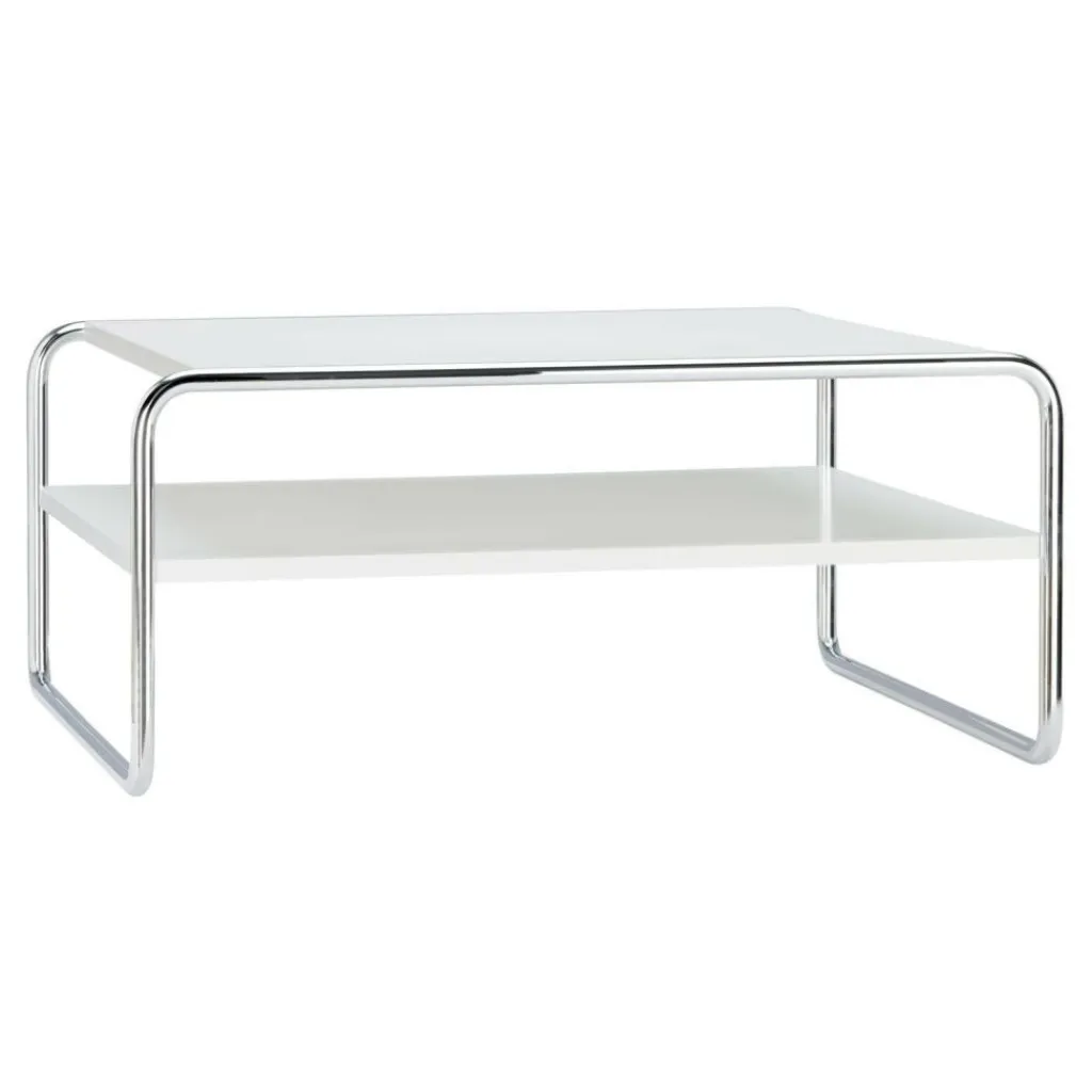 Das Gestell des Couchtisches besteht wie bei seinen Vorbildern aus verchromtem Stahlrohr, welches gebogen wurde und sich so durch seine leichte Rundung perfekt von der Tischfläche abhebt. Im Gegensatz dazu steht die flache, rechteckige Tischplatte aus Eschenholz. Funktionalität ist ein wichtiges Merkmal der Bauhaus-Schule und dieser Aspekt zeigt sich insbesondere in der zweiten Ablagefläche des Couchtisches. Hier haben Sie genügend Platz, um Zeitschriften und Bücher abzulegen oder elektronische Geräte zu verstauen, ohne dass diese sofort sichtbar sind. Das zurückhaltende Design macht den B 20/1 Couchtisch/Beistelltisch Esche zu einem wahren Kombinationstalent und kann in jedem Raum seine Funktion erfüllen sei es als Couchtisch im Wohnzimmer, als Ablagemöglichkeit im Schlafzimmer oder im Flur oder als Beistelltisch im Arbeitszimmer und in der Leseecke.