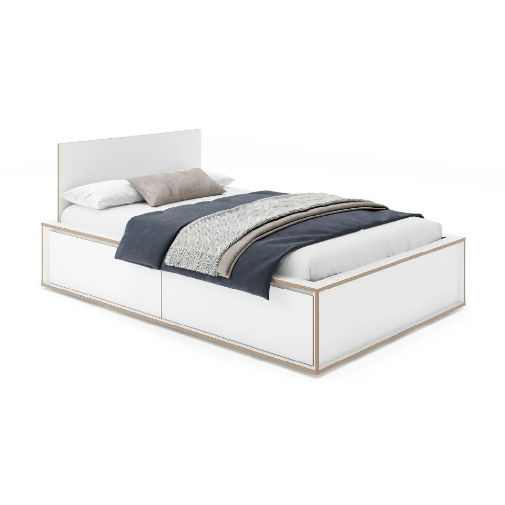 Dank seiner großzügigen Breite bietet das Spaze Einzelbett mit hohem Kopfteil 140x200cm auch einer zweiten Person Platz. Damit eignet es sich für ein Jugendzimmer und ist eine platzsparende Lösung für ein Gästezimmer. Zudem verbindet der praktische Bettkasten einen kompakten Platzbedarf mit größtmöglichem Stauraum. Hergestellt aus hochwertigem Birkenschichtholz zeichnet sich das Designbett durch eine gute Belastbarkeit aus. Der glatten Oberfläche seiner Laminatbeschichtung verdankt es einen freundlichen und sauberen Charakter, während die unbeschichteten Kanten einen verspielten Touch ins Ambiente bringen. Für ein sicheres Schlafgefühl sorgt das hohe Kopfteil, das eine feste Stütze zum Anlehnen bietet und dabei die Wand schont. Mit regionalen Materialien erzeugt, ist das Spaze Einzelbett mit hohem Kopfteil 140x200cm eine nachhaltige Wahl.