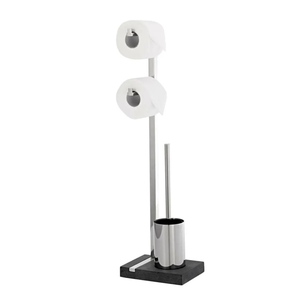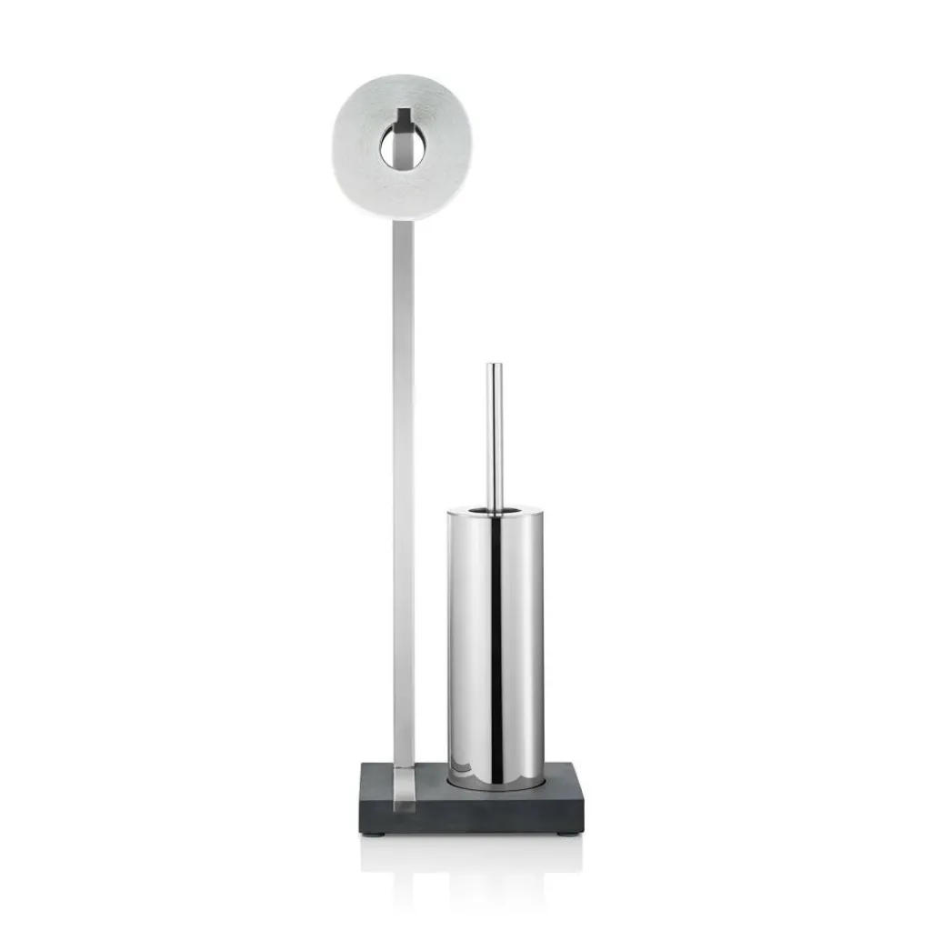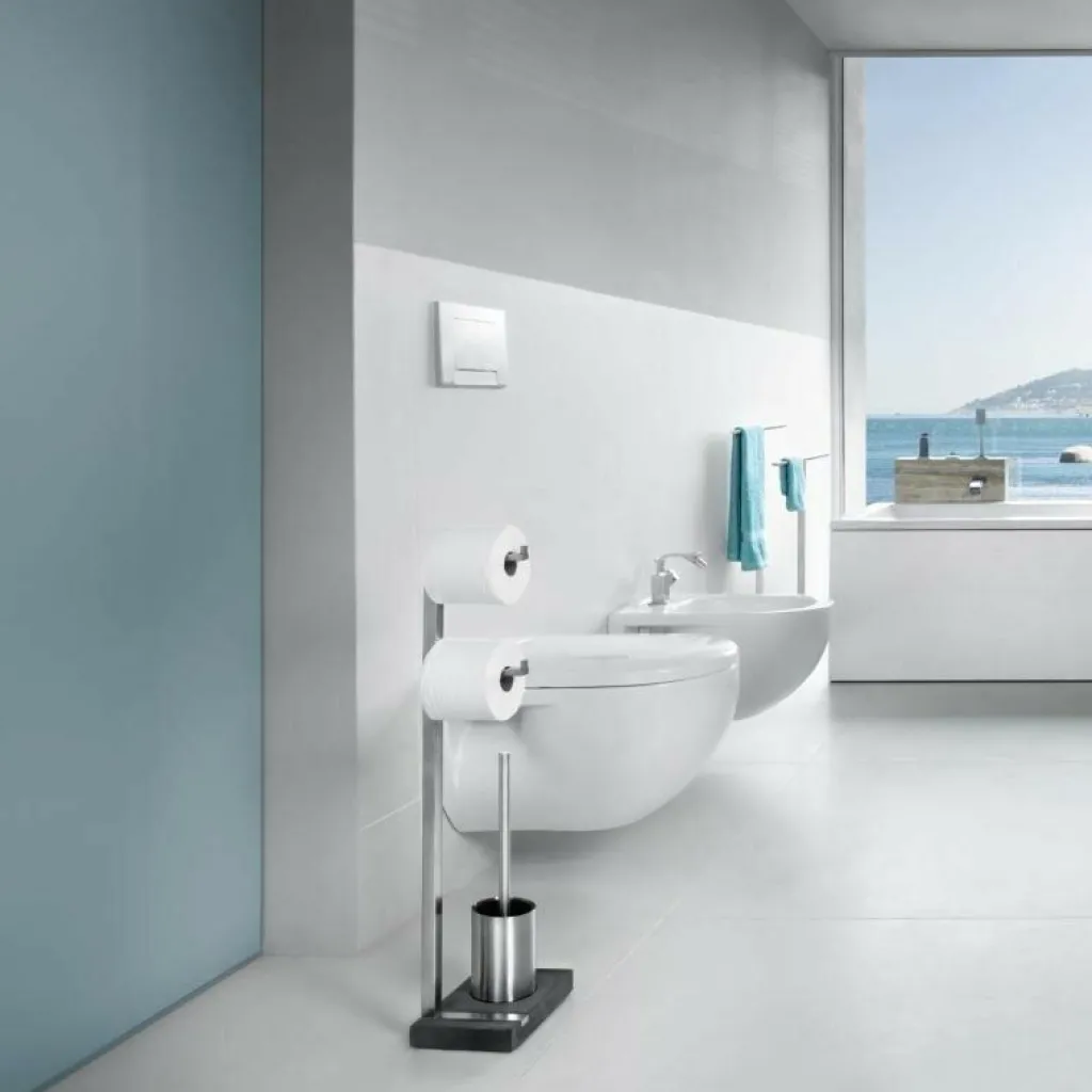 Der Menoto Toilettenbutler wurde von Flöz Design für den Hersteller Blomus entworfen. Er ist dezent und doch auf seine Weise ein unverzichtbarer Diener im privatesten Umfeld. Der Menoto Toilettenbutler besticht durch klare Linien in glänzendem Edelstahl und einen kompakten Sockel aus Kunststein. In verschiedenen Modellen erhältlich, wählt man je nach Sympathie seinen Butler mit ein oder zwei Halterungen für Toilettenpapier. Auch die Toilettenbürste ist in einem schmalen Edelstahlbehälter integriert. Dieser Butler ist übrigens in einer ebenso schlichten wie stylishen Kollektion erschienen, damit Ihr Bad auch noch weitere Elemente von Blomus erhalten kann.
