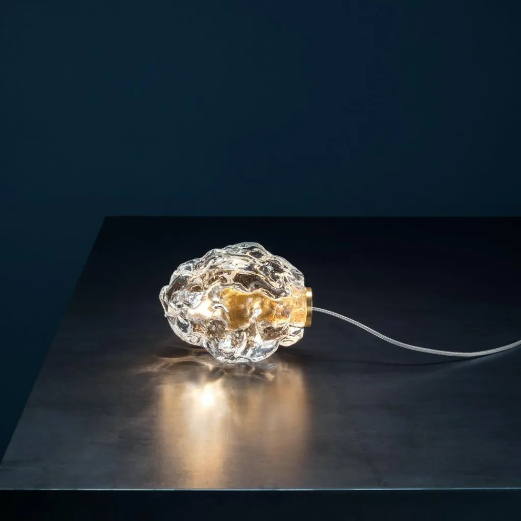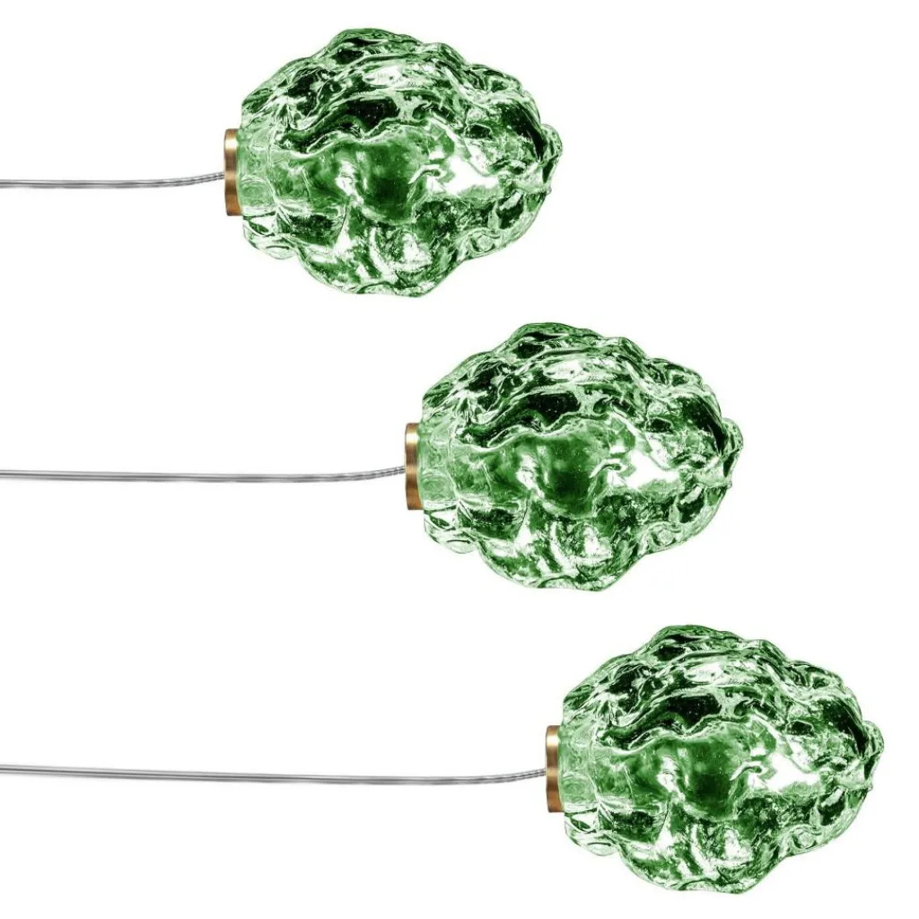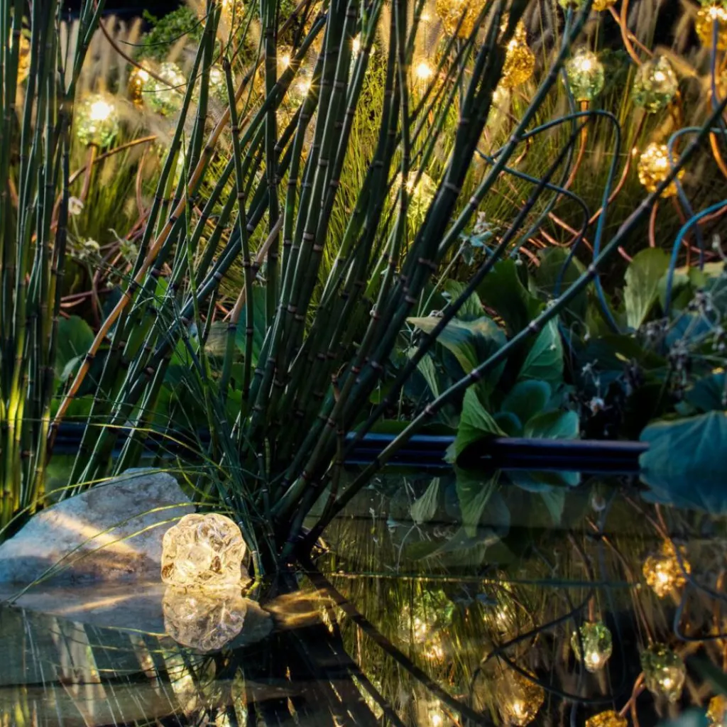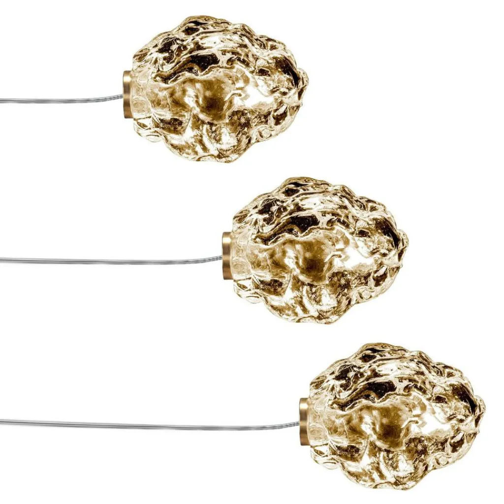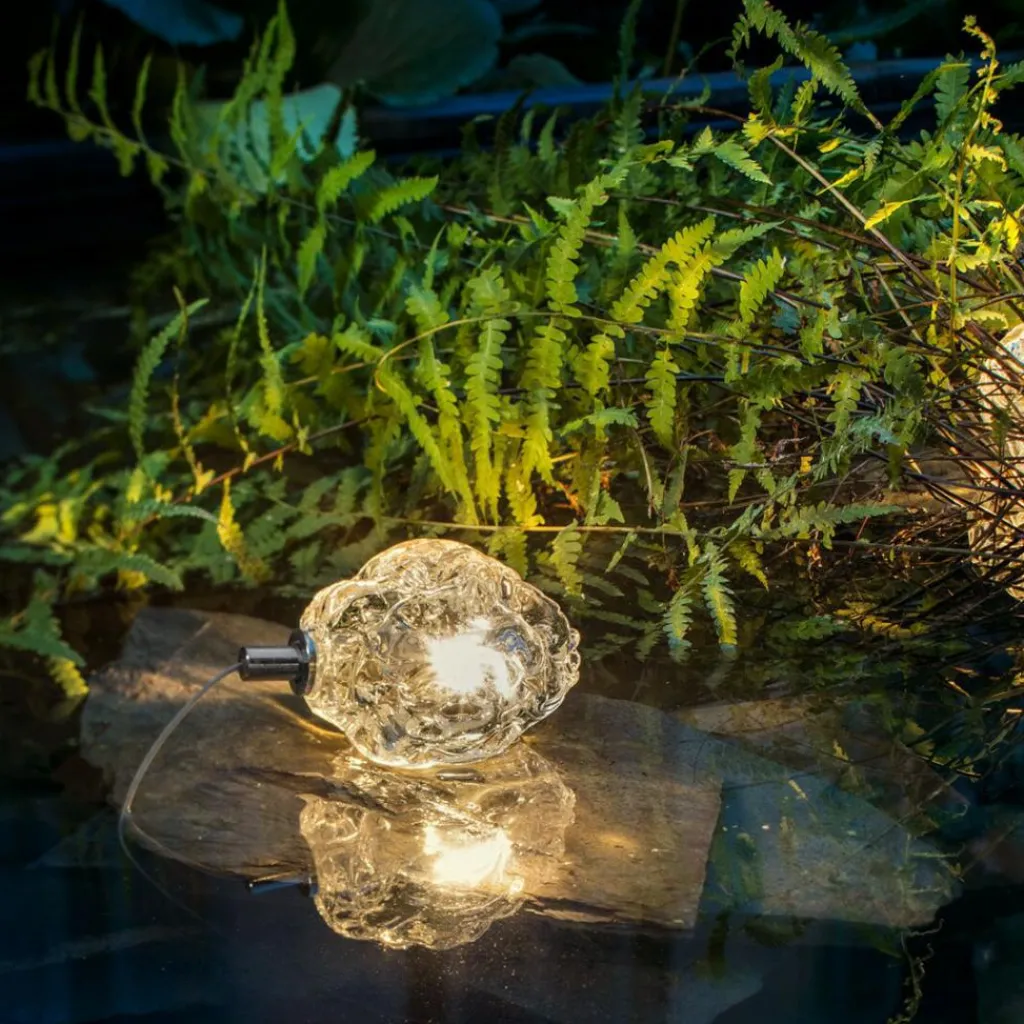In aufwendiger Handarbeit werden die Leuchtenschirme des Sets gefertigt: Sie sehen aus wie ein edler Rohdiamant. Diese Optik verdanken sie dem einzigartigen Produktionsverfahren: Dabei wird flüssiges Glas in eine ovale Form mit unebener Oberfläche eingelassen. Der Schirm sitzt auf einem Messingring, aus dem wiederum das 300 cm lange Kabel entspringt. Nicht im Lieferumfang enthalten ist der Trafo, der unter Zubehör mitbestellt werden kann. Ist das More 0 Outdoor Bodenleuchte 3er Set gerade nicht eingeschaltet, verschwinden die durchsichtigen Glaskörper harmonisch im Garten. Kaum wird es zum Leben erweckt, strahlt es seine Umgebung von unten an.