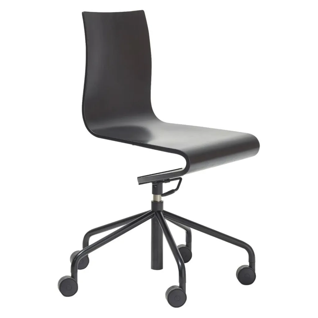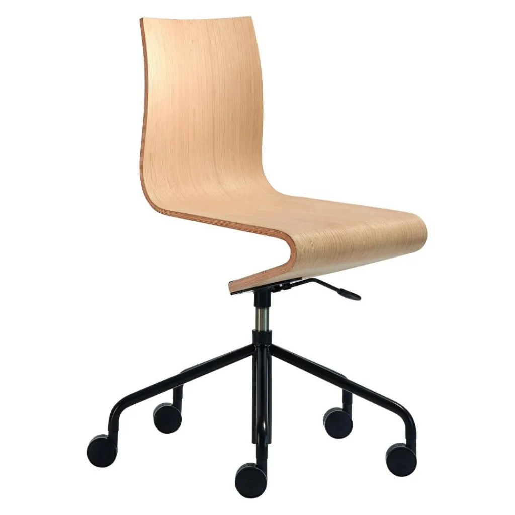 Ein ergonomisch geformter Sitz, ein stabiler Sternfuß mit fünf drehbaren Rollen und eine Gasfeder, um die Sitzhöhe anzupassen, machen den Seesaw Bürostuhl zu einem Möbelstück, das maximale Flexibilität beim Arbeiten ermöglicht. Das wie gefaltet erscheinende Design der Sitzschale sorgt dafür, dass der Körper dabei in Bewegung bleibt. Dies schont die Wirbelsäule ähnlich dem Sitzen auf einem Sitzball. Möglich wird dies durch in Form gebogene Holzschichten. Mit naturbelassenem oder lackiertem Eschen- oder Eichenholz furniert, zeigt die Oberfläche der Sitzschale eine attraktive Maserung. Gleichzeitig verbindet der 5-Stern-Fuß aus pulverbeschichtetem Stahl eine zurückhaltende Optik mit einer hohen Belastbarkeit. Dieser Bürostuhl mit Rollen passt an den Schreibtisch, in einen Konferenzraum oder an den Küchentisch daheim.