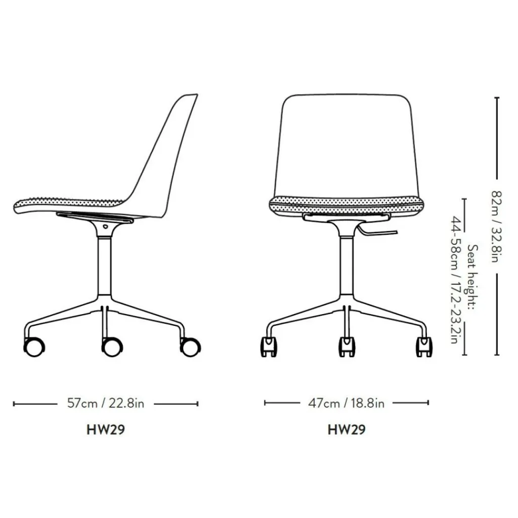 Am oberen Ende des Aluminiumgestells ist ein kleiner Hebel montiert, der einen Gaslift bedient. Damit lässt sich die Sitzhöhe zwischen 44 und 58 cm variieren. Die ergonomische Form des Bürodrehstuhls sorgt dafür, dass auch bei längerem Verweilen der Sitzkomfort ausgezeichnet bleibt. Die Gesamthöhe des Rely HW29 Bürodrehstuhls inklusive Rückenlehne beträgt 82 cm. Das Büromöbel ist 47 cm breit und 57 cm tief. Das Gewicht beträgt 10,2 kg.
