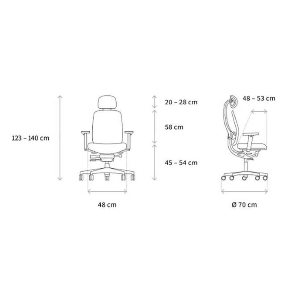 Der Limited Black Edition AluMedic Bürostuhl ist 70cm breit und ebenso tief. Er hat eine Sitzhöhe von 45 bis 54cm. Seine Gesamthöhe misst je nach Höheneinstellung 123 bis 140cm. Das Büromöbel hat ein Gewicht von 25,3kg. Es ist wahlweise mit Rollen für Teppich- oder Hartböden erhältlich. Daneben gibt es weitere Bürostühle aus der AluMedic-Serie.