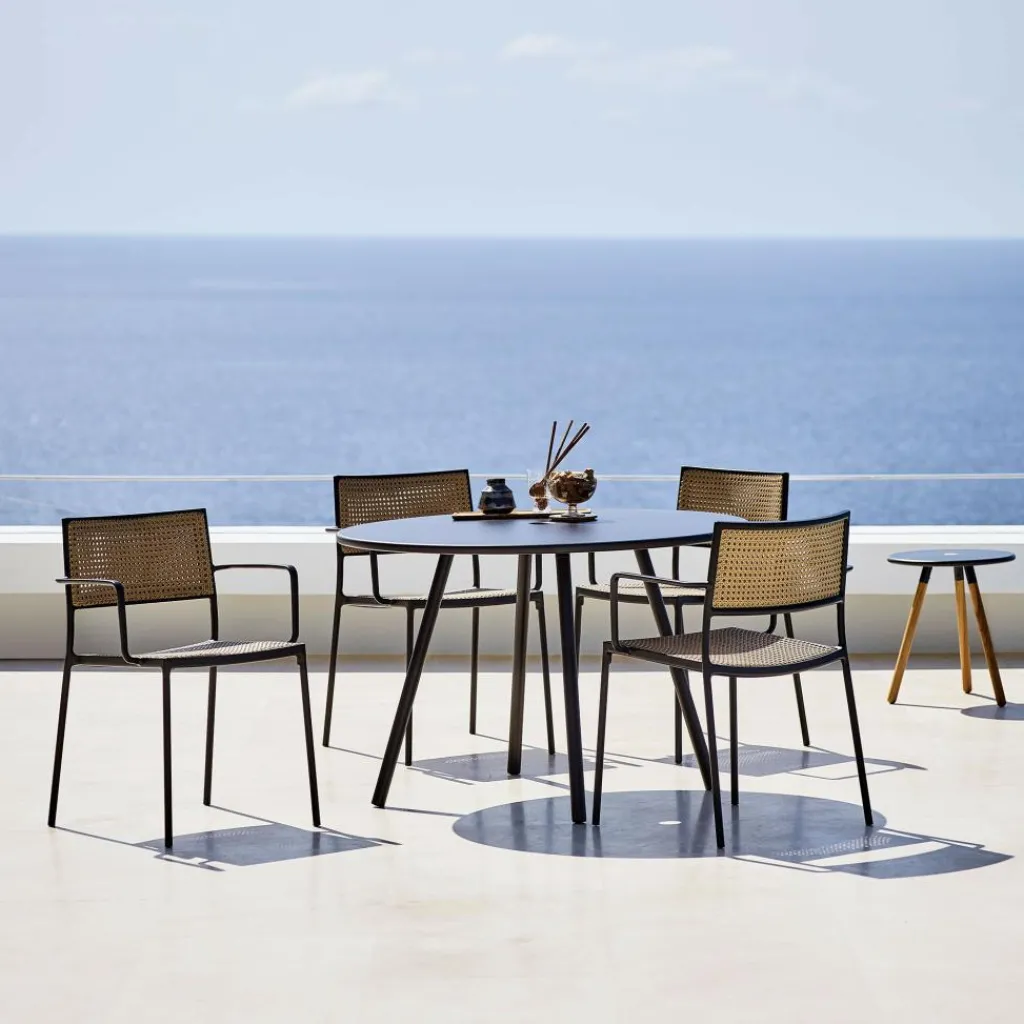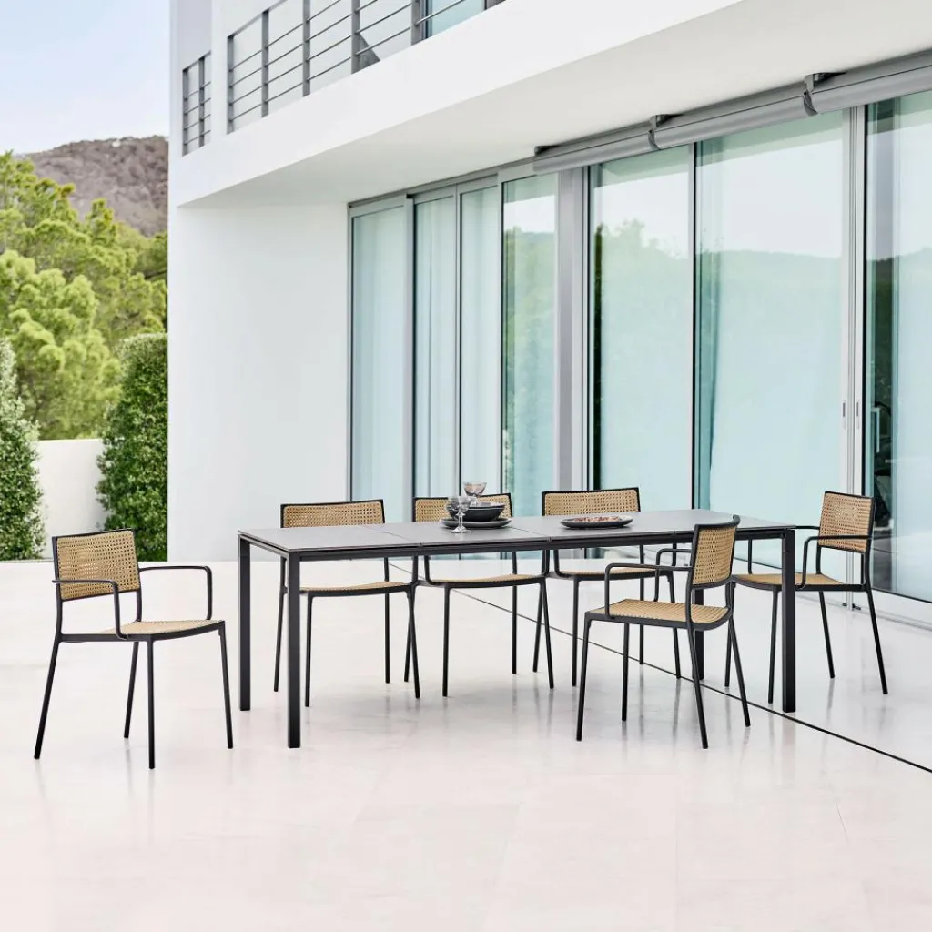 Dank seines schlichten Designs passt der Less Sessel stapelbar in jeden Garten, auf die Terrasse oder den Balkon. Er besteht aus einem schlichten Rahmen aus pulverlackiertem Aluminium. Die beiden hinteren Füße sind leicht ausgestellt, was die Standfestigkeit verbessert. An den beiden Seiten werden sie in Armlehnen weitergeführt, die den Sitzkomfort noch mehr steigern. Der Less Sessel stapelbar eignet sich für den gemütlichen Familiennachmittag, für Partys und jeden anderen Anlass. Werden einzelne Stühle einmal nicht gebraucht, lassen sie sich gestapelt platzsparend verstauen. Die Sitzfläche und die Rückenlehne bestehen aus Cane-line French Weave, einem robusten Geflecht, das es in mehreren Farben gibt. Da durch die Zwischenräume Wasser schnell abfließt, kann der Less Sessel stapelbar auch nach einem Regenguss rasch wieder verwendet werden.