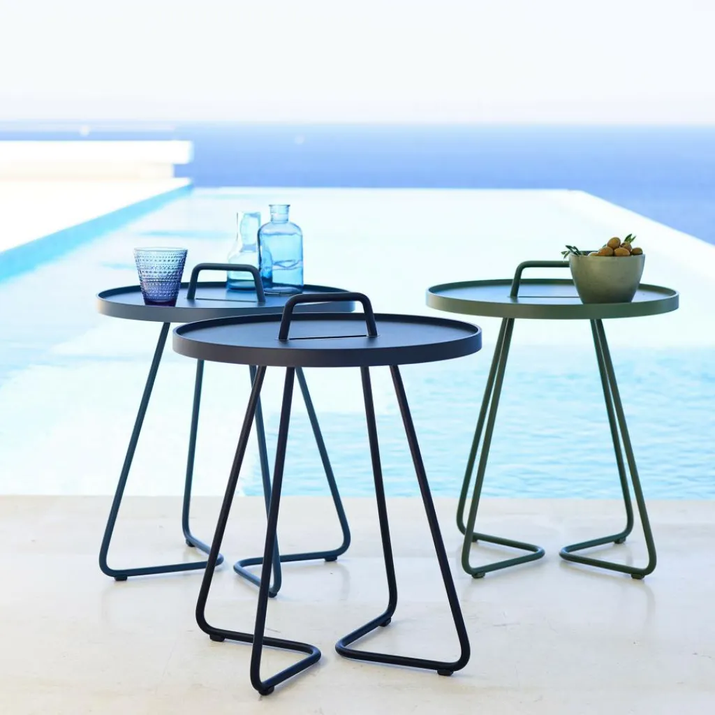 Beim On-the-move Beistelltisch L handelt es sich nicht nur um ein praktisches, sondern auch um ein ästhetisches Möbelstück. Es besteht aus einem aus zwei Teilen gefertigten Gestell, wobei zwei Dreiecke am Boden den Standfuß bilden. An der Oberseite sitzt eine runde Tischplatte, wo sich Getränke und Speisen ablegen lassen. Doch auch für Bücher, Zeitschriften und andere Utensilien ist das Modell geeignet. Gefertigt ist der On-the-move Beistelltisch L aus pulverbeschichtetem Aluminium. Das hochwertige Material hält Wind und Wetter stand, daher ist der Tisch auch für den Outdoorbereich perfekt geeignet. Er ist auf dem Balkon, auf der Terrasse oder neben dem Pool eine praktische Ablagefläche.