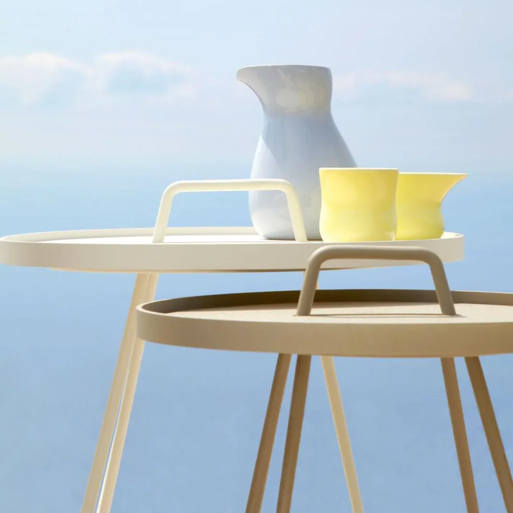 Mit einem Handgriff verwandelt sich der On-the-move Beistelltisch L in ein Tablett. Die Tischplatte lässt sich nämlich abnehmen: So kann man bequem Nachschub an Getränken oder anderen Utensilien aus der Küche oder dem Wohnraum holen. Der Tisch ist 60 cm hoch und weist einen Durchmesser von 52 cm auf.