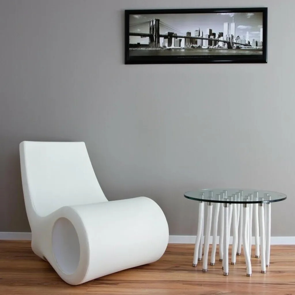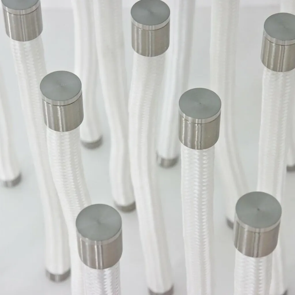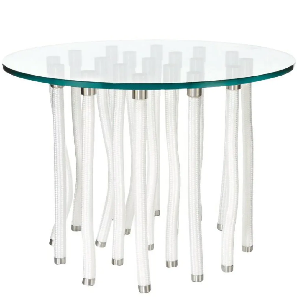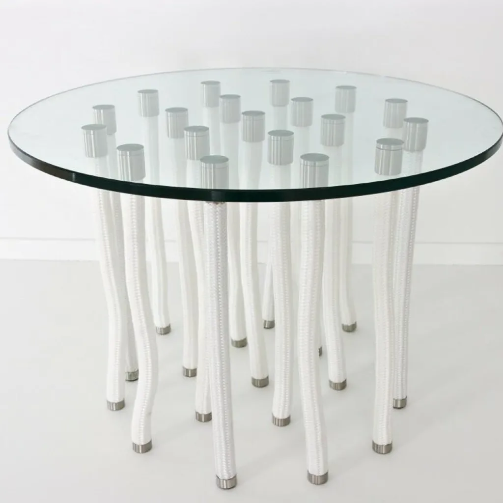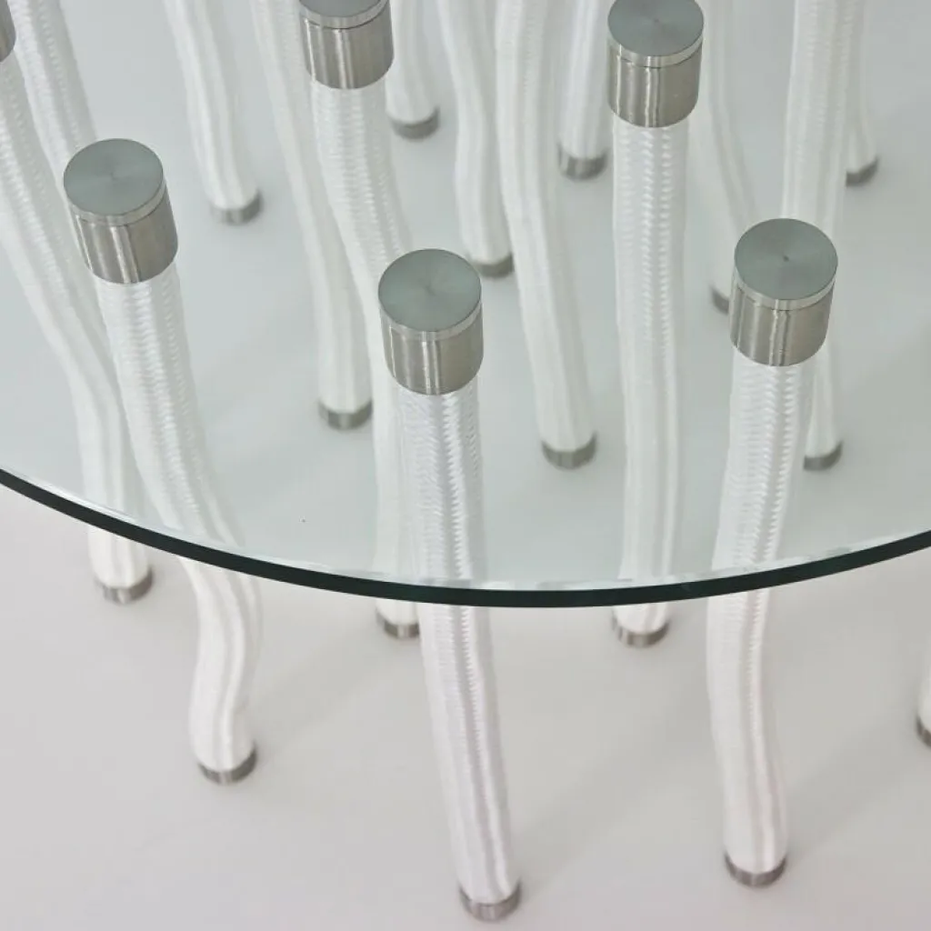 Das Design vermittelt den unrealistischen und paradoxen Eindruck, dass dieser Tisch auf weichen Kordelbeinen steht. Was der Betrachter nicht weiß: Die Struktur besteht teilweise aus biegbaren Kordelbeinen aus Polypropylen und teilweise festen Beinen mit Innenkern aus Stahl, die die Tischplatte aus Glas tragen. Die Verbindungsteile zwischen Beinen und Platte werden ebenfalls aus satiniertem Edelstahl gefertigt. Eine grazile und doch robuste Kombination.