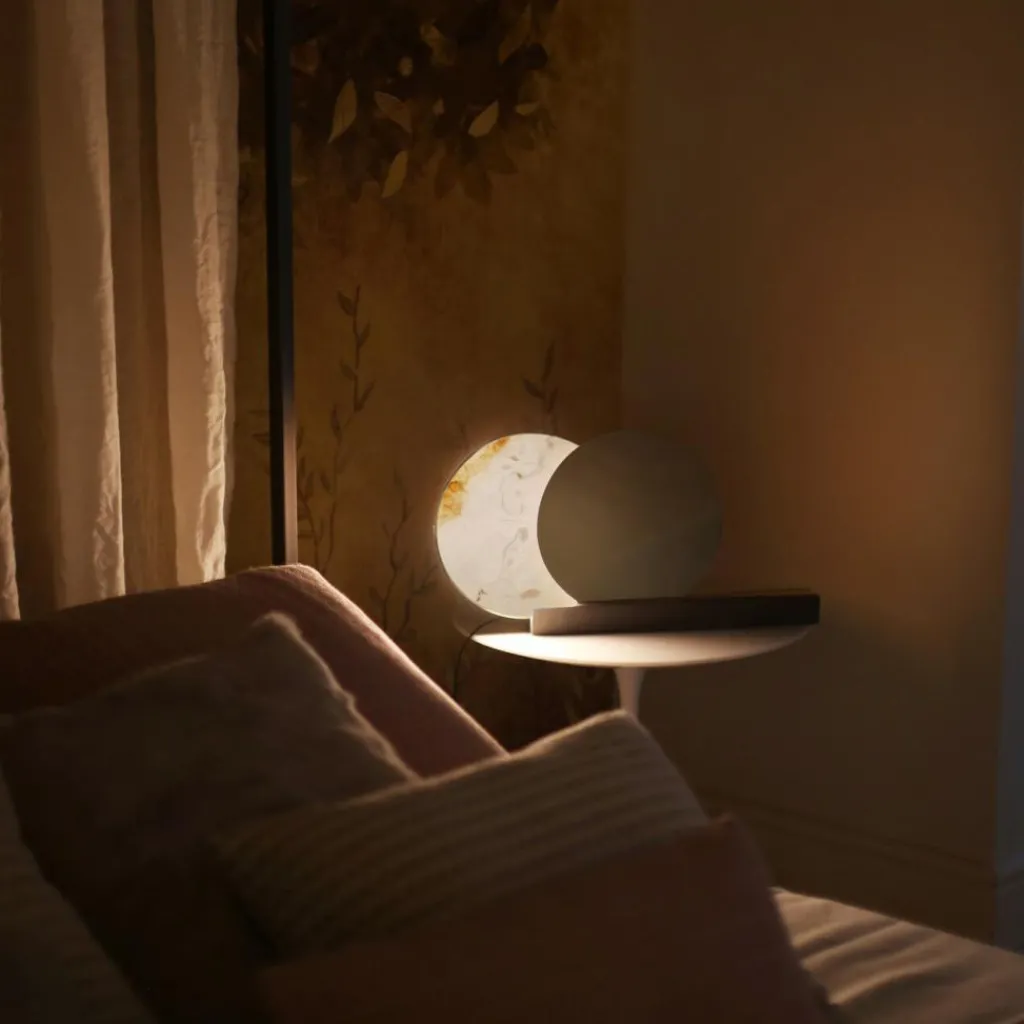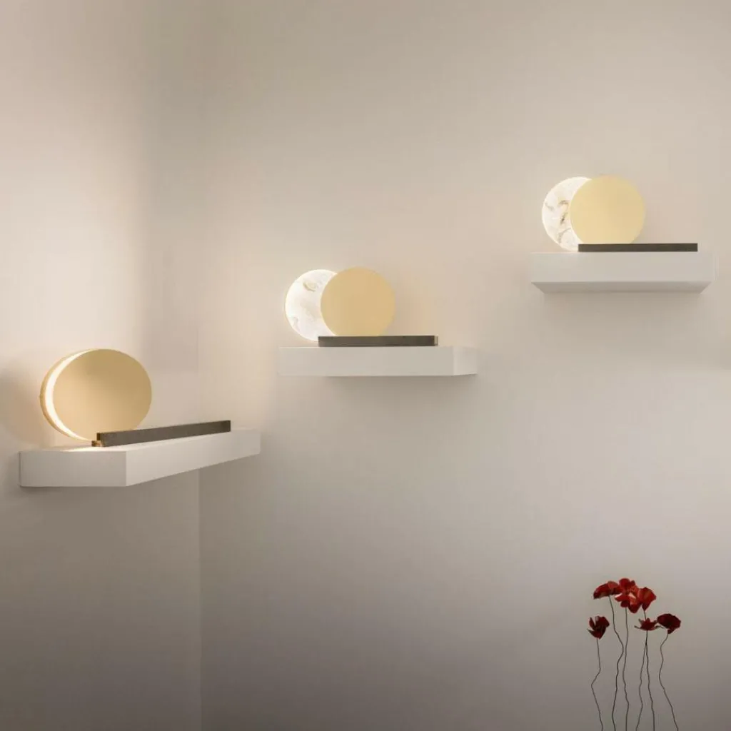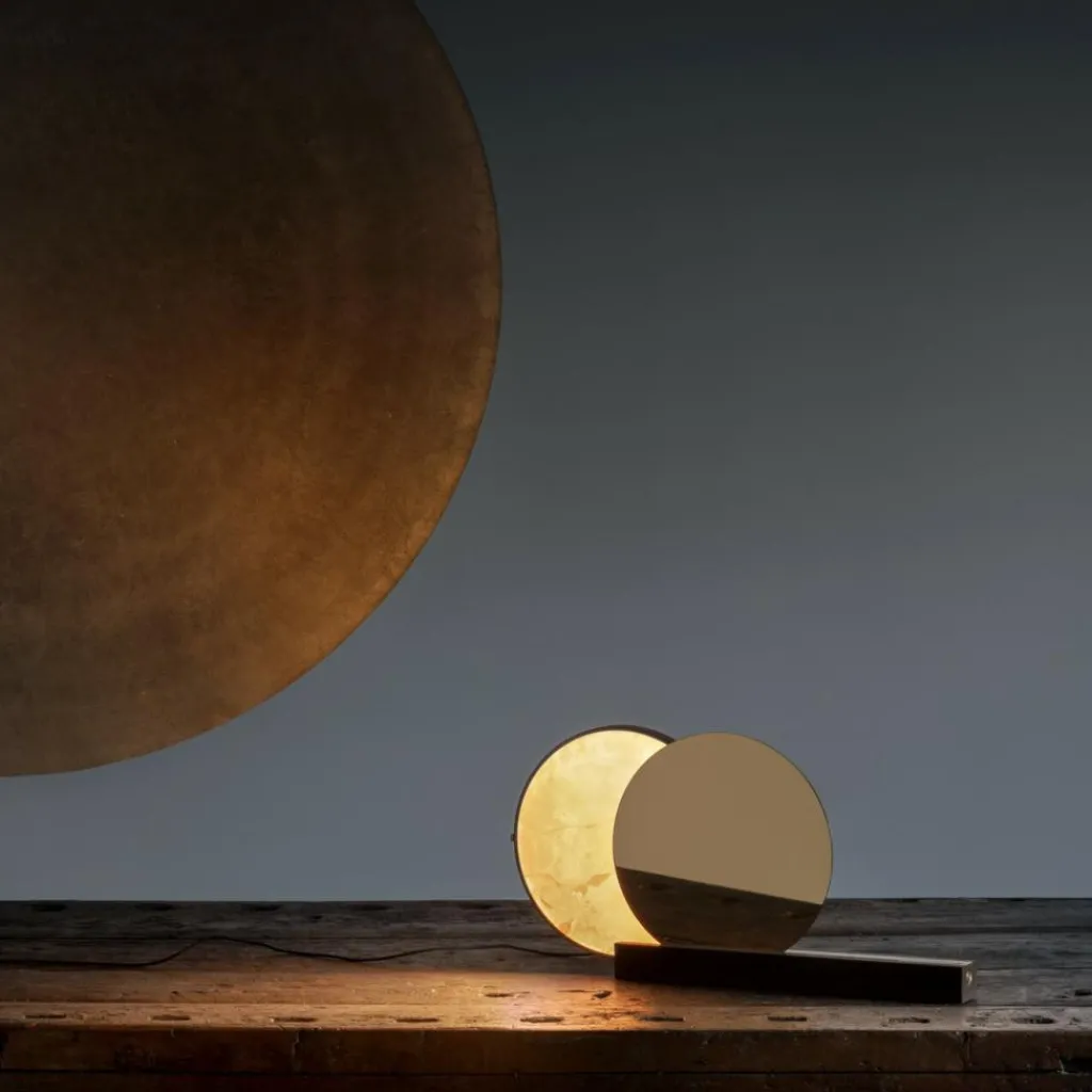 Sonne und Mond, Yin und Yang – in der Natur und vielen Kulturen fasziniert der Kontrast zwischen hell und dunkel ebenso wie bei der Alchemie T LED Tischleuchte. Für das außergewöhnliche Modell verwendet Archimede erlesene Materialien. Zwei Scheiben werden zum Blickfang. Eine besteht aus edlem Alabaster, die andere ist aus Messing gefertigt. Beide werden von einem fest verbauten Leuchtmittel angestrahlt, das nicht ausgetauscht werden kann. Befestigt sind die Scheiben auf einem Fuß aus Medea-Kalkstein. Auf einer Schiene lassen sie sich hin- und herschieben. Kommen sie genau auf derselben Höhe zum Stehen, entsteht der Eindruck einer Sonnenfinsternis.