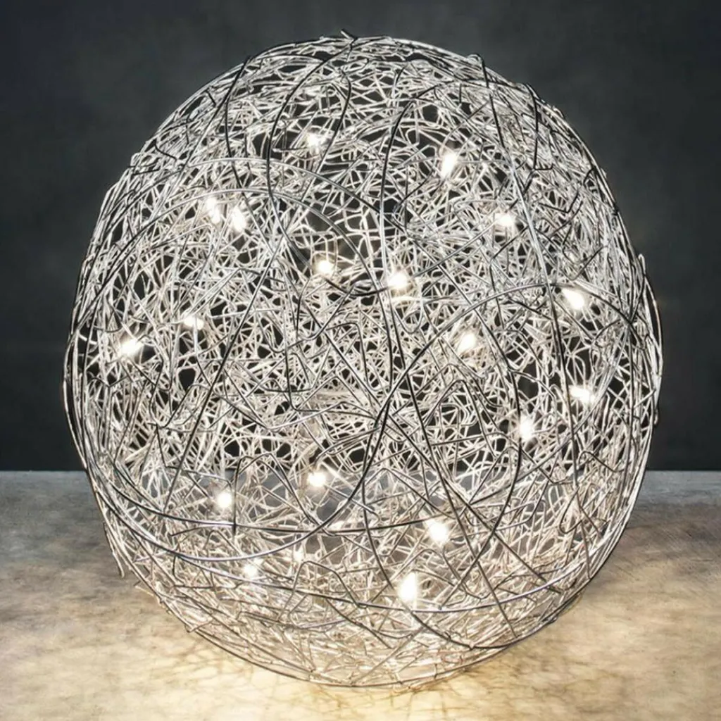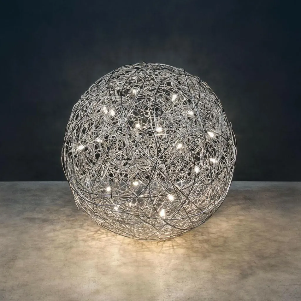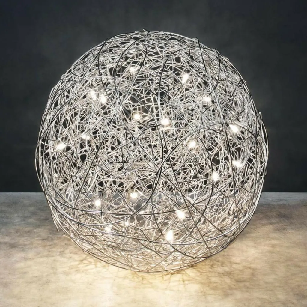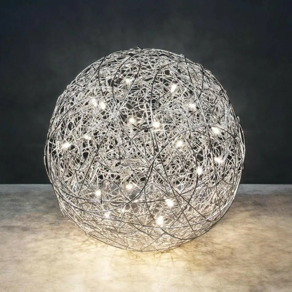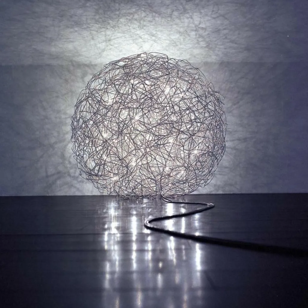 Die charaktervolle Fil de Fer F Bodenleuchte gehört dabei zu den wahren Lieblingen des Designers. Die einer runden Grundform folgende Leuchte besteht aus geflochtenem Aluminiumdraht und stellt durch die freie Modellierung und Anordnung in jedem Fall ein echtes Einzelstück dar. Im Inneren der Leuchte, die zunächst ein Spezialauftrag war und später in serielle Produktion ging, sind je nach Größe der Leuchte zwischen 8 und 20 Leuchtmittel untergebracht, die die Umgebung des am Boden liegenden Knäuels erhellen und im Lieferumfang enthalten sind. Die aufsehenerregende Fil de Fer F Bodenleuchte ist mit einem 270cm langen Kabel ausgestattet, das Ihnen eine flexible Aufstellung ermöglicht. Ein eingebauter Dimmer erlaubt es, eine märchenhafte Stimmung ganz nach den persönlichen Wünschen zu kreieren und die Bodenleuchte nicht nur als pures Leuchtmittel zu nutzen, sondern sie als einen Teil der Heimdekoration zu betrachten.