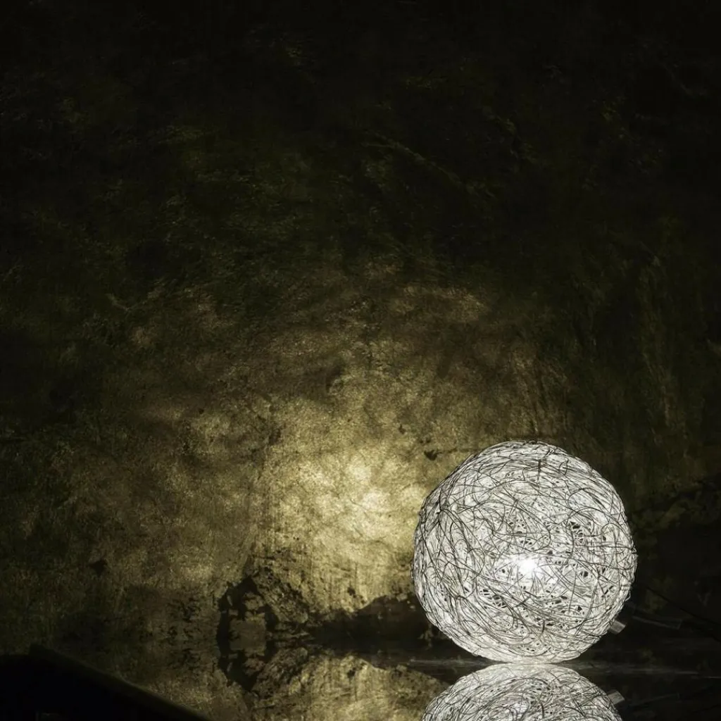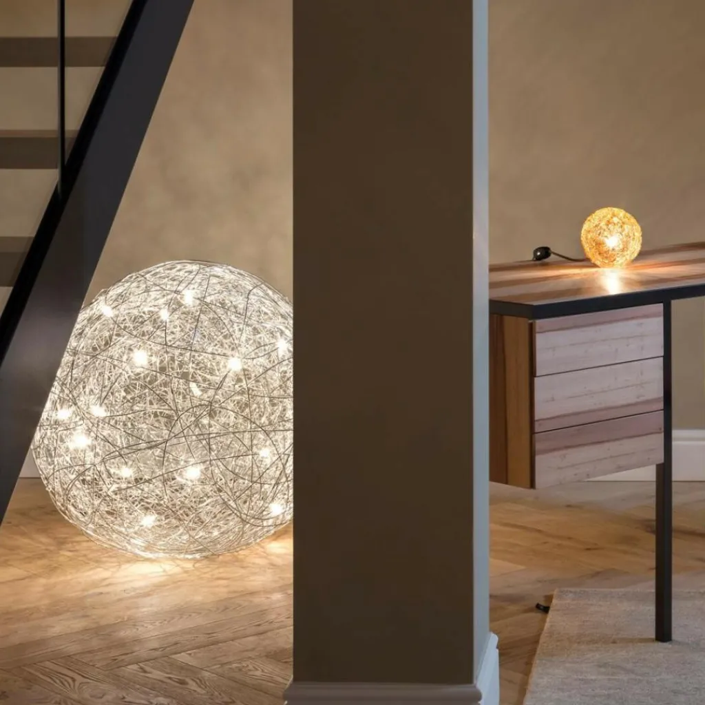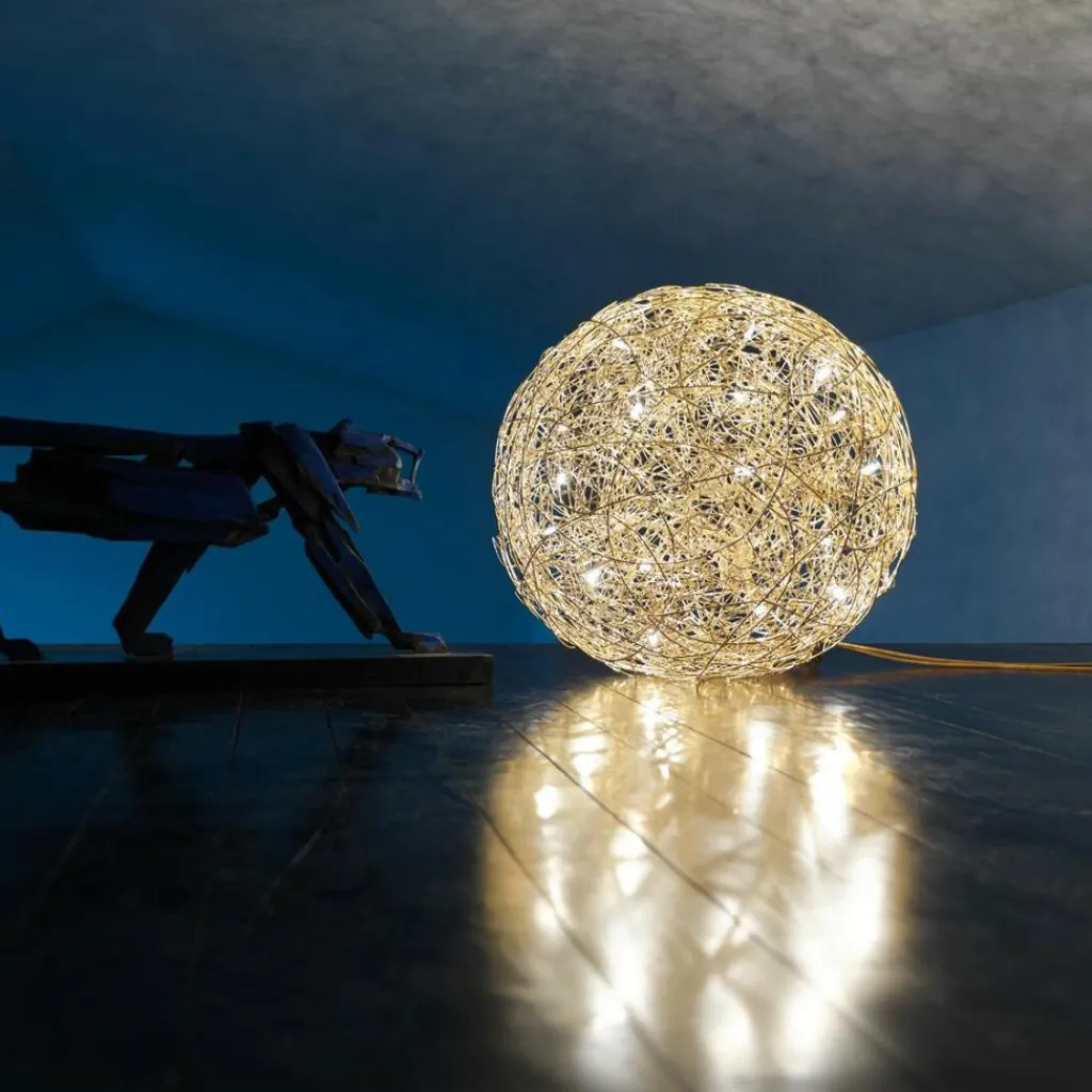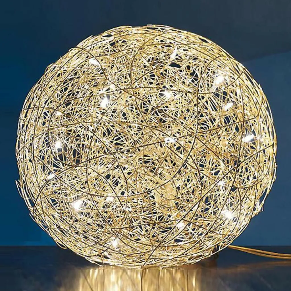 Die charaktervolle Fil de Fer F Bodenleuchte gehört dabei zu den wahren Lieblingen des Designers. Die einer runden Grundform folgende Leuchte besteht aus geflochtenem Aluminiumdraht und stellt durch die freie Modellierung und Anordnung in jedem Fall ein echtes Einzelstück dar. Im Inneren der Leuchte, die zunächst ein Spezialauftrag war und später in serielle Produktion ging, sind je nach Größe der Leuchte zwischen 8 und 20 Leuchtmittel untergebracht, die die Umgebung des am Boden liegenden Knäuels erhellen und im Lieferumfang enthalten sind. Die aufsehenerregende Fil de Fer F Bodenleuchte ist mit einem 270cm langen Kabel ausgestattet, das Ihnen eine flexible Aufstellung ermöglicht. Ein eingebauter Dimmer erlaubt es, eine märchenhafte Stimmung ganz nach den persönlichen Wünschen zu kreieren und die Bodenleuchte nicht nur als pures Leuchtmittel zu nutzen, sondern sie als einen Teil der Heimdekoration zu betrachten.