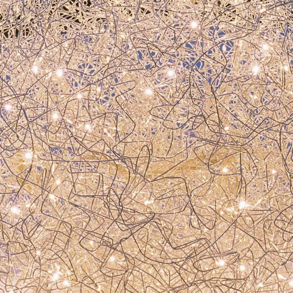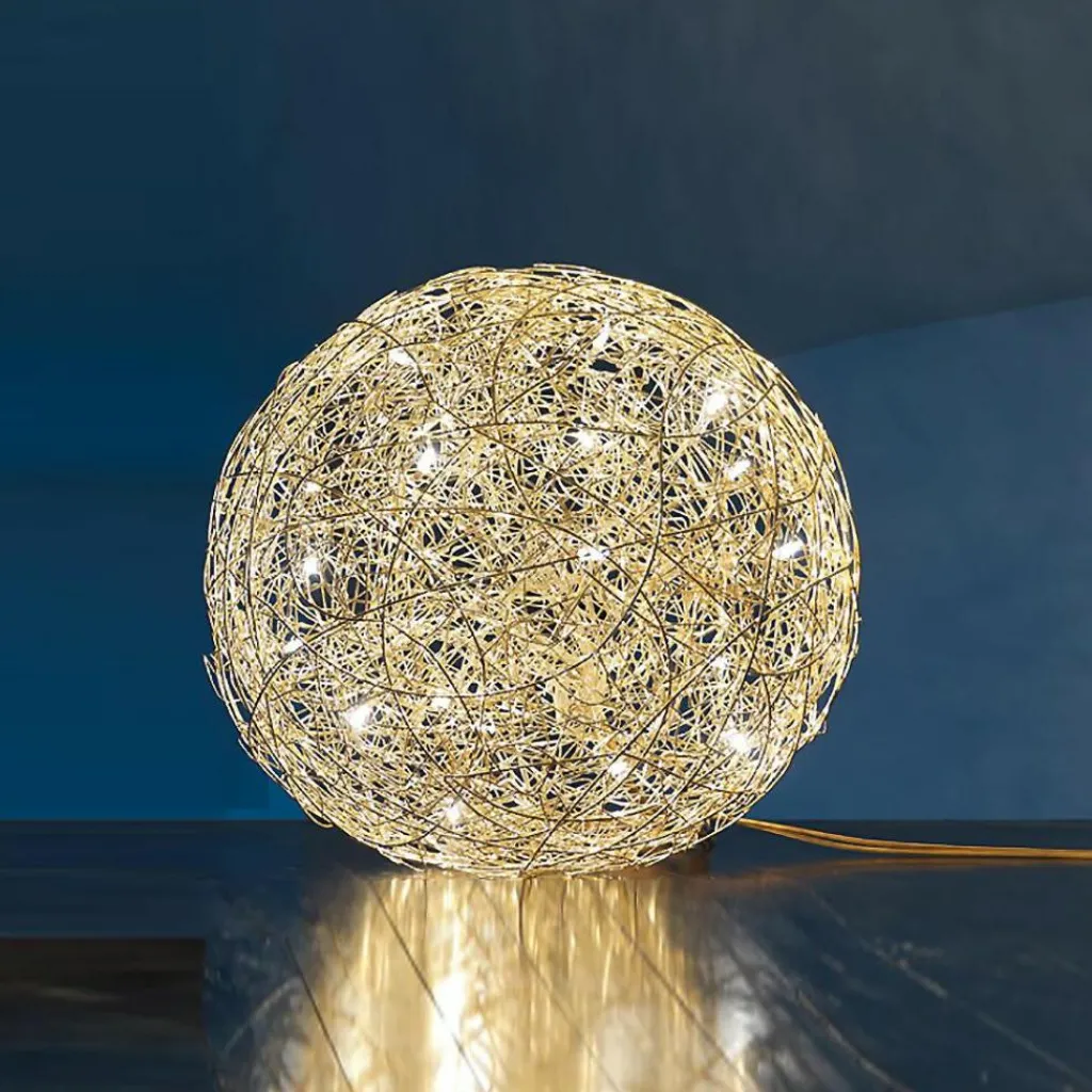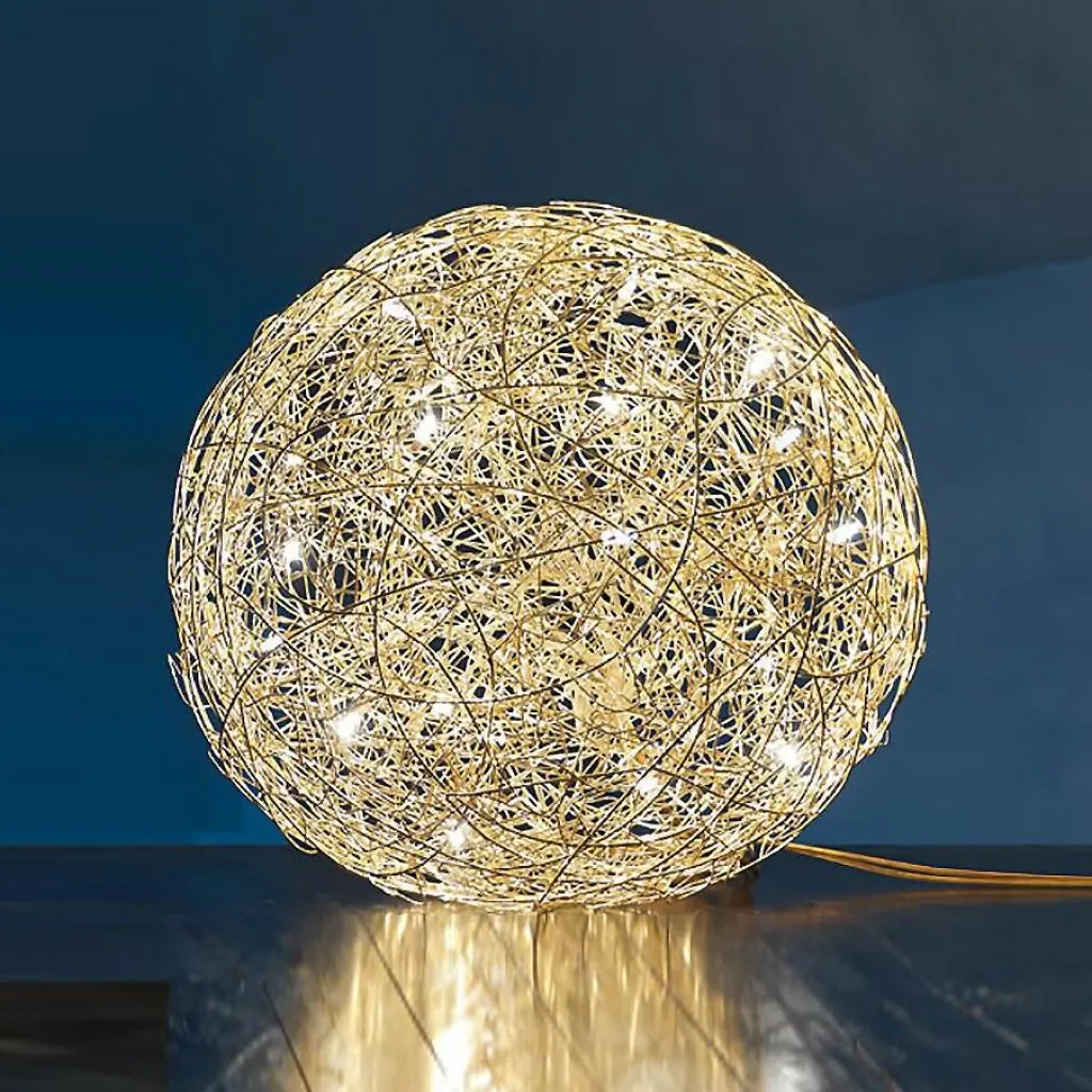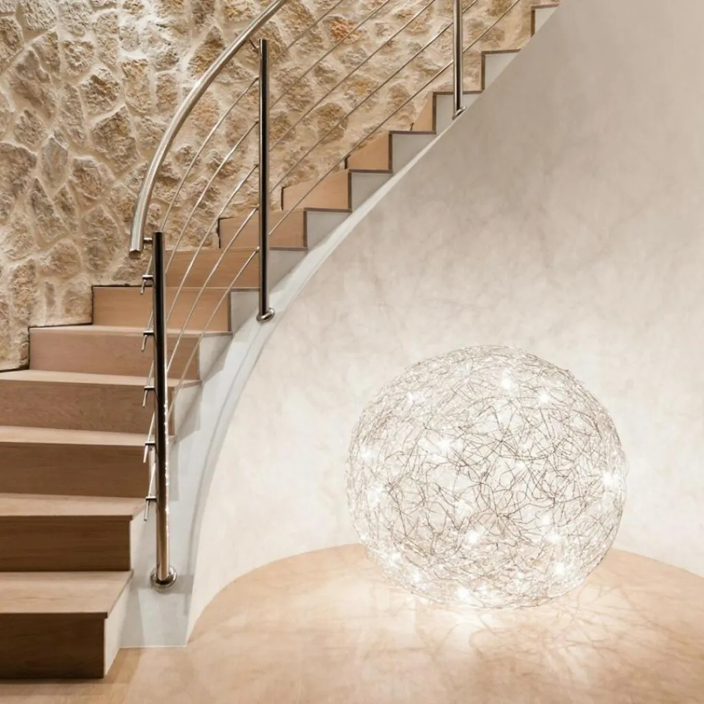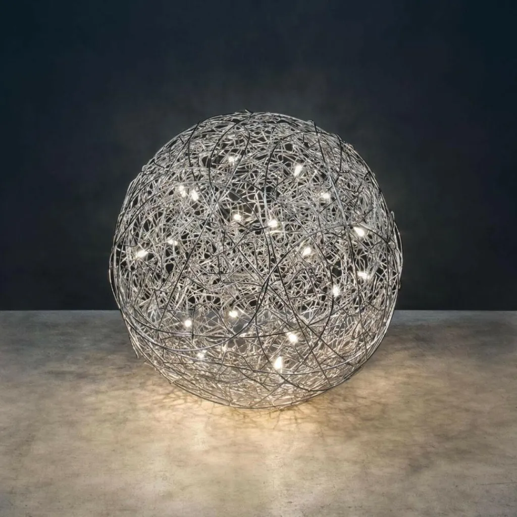 Die charaktervolle Fil de Fer F Bodenleuchte gehört dabei zu den wahren Lieblingen des Designers. Die einer runden Grundform folgende Leuchte besteht aus geflochtenem Aluminiumdraht und stellt durch die freie Modellierung und Anordnung in jedem Fall ein echtes Einzelstück dar. Im Inneren der Leuchte, die zunächst ein Spezialauftrag war und später in serielle Produktion ging, sind je nach Größe der Leuchte zwischen 8 und 20 Leuchtmittel untergebracht, die die Umgebung des am Boden liegenden Knäuels erhellen und im Lieferumfang enthalten sind. Die aufsehenerregende Fil de Fer F Bodenleuchte ist mit einem 270cm langen Kabel ausgestattet, das Ihnen eine flexible Aufstellung ermöglicht. Ein eingebauter Dimmer erlaubt es, eine märchenhafte Stimmung ganz nach den persönlichen Wünschen zu kreieren und die Bodenleuchte nicht nur als pures Leuchtmittel zu nutzen, sondern sie als einen Teil der Heimdekoration zu betrachten.