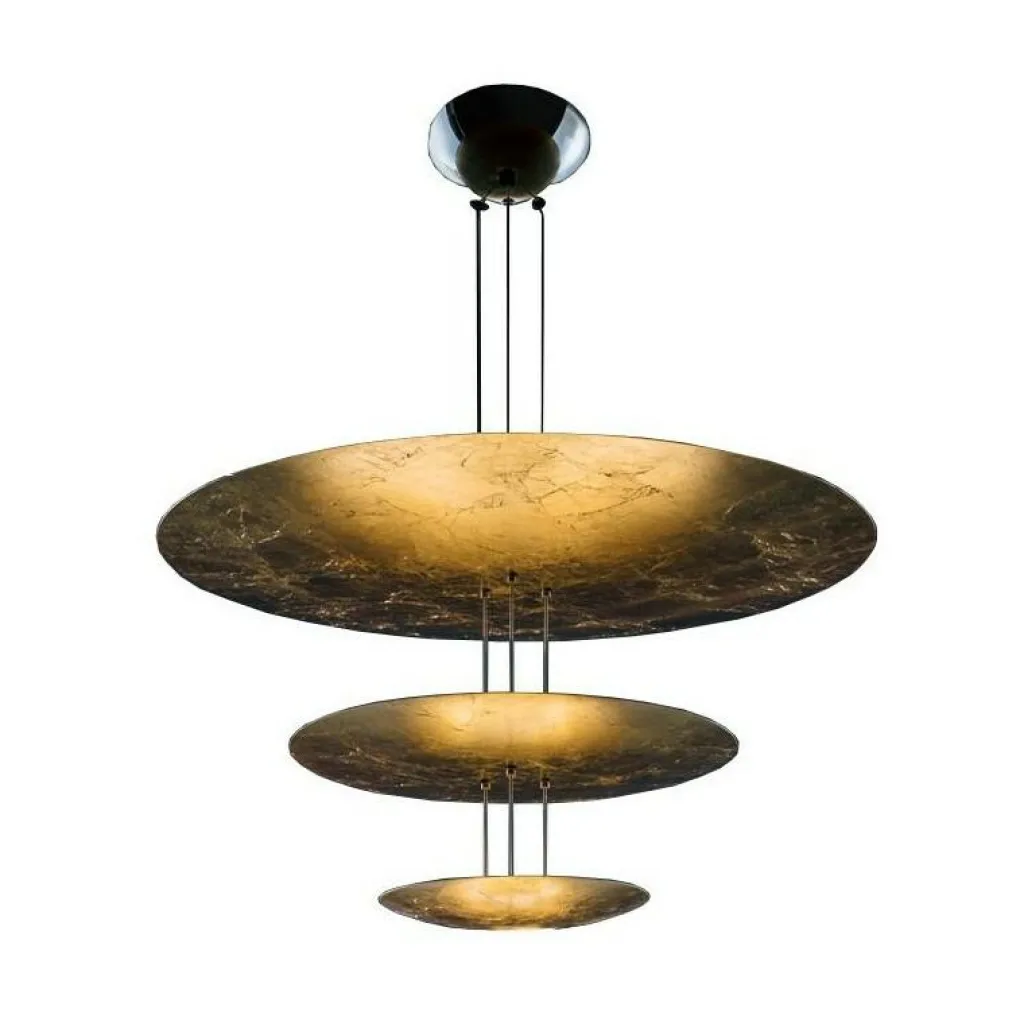 Einmal mehr spielt Catellani bei dem Entwurf mit außergewöhnlichen Materialien und erzeugt dadurch ein einzigartiges Licht- und Schattenspiel. Gefertigt ist die Macchina Della Luce I LED Pendelleuchte aus drei dünnen Scheiben mit Durchmessern von 30, 50 und 80cm, wobei die kleinste ganz unten montiert ist. Da sich in jeder Scheibe eine separate LED-Leuchte befindet, entsteht ein ganz besonders Ambiente im Raum. Verstärkt wird der Eindruck, weil die oberste Scheibe nicht wie die beiden anderen matt, sondern mit glänzender Oberfläche, gefertigt ist. Wie gerne Catellani mit verschiedenen Materialien spielt, beweist die Tatsache, dass er sie bei der Macchina Della Luce I LED Pendelleuchte variiert: Die Scheiben glänzen nämlich in Aluminium, Silber und Gold. Die Höhe der Leuchte bestimmt ein 145cm langer Stab, der je nach individuellem Platzangebot angepasst werden kann. Insgesamt ist die Leuchte mit fünf LEDs ausgestattet, die fest in der Leuchte eingebaut sind. Praktisch ist außerdem, dass das Licht blendfrei an die Umgebung abgegeben wird und die Leuchte mit einer Dimmerfunktion ausgestattet ist.