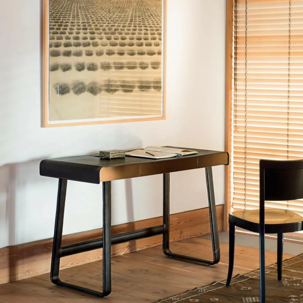 Das Gestell des Pegasus Home Desk Schreibtisch ist mit Kernleder mit einer Kontrastnaht ummantelt. Für problemloses Arbeiten und Ordnung sorgt eine Schublade und 4 Ablagefächer aus farbig matt lackiertem HPL/Multiplex. Die Leder-Schreibfläche ist seitlich hochklappbar. Darüber hinaus besitzt der Sekretär einen Kabeldurchlass sowie höhenverstellbare Metallgleiter.