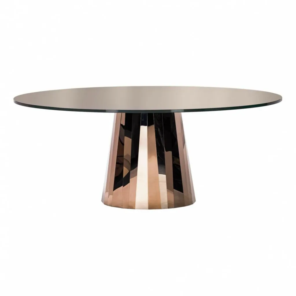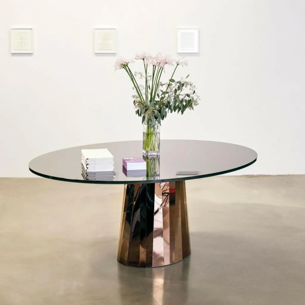 Der Pli Esstisch Tischplatte lackiert zeichnet sich mit Eleganz aus. Aus diesem Grund wird er gerne in edlen Restaurants oder in Wohn- und Esszimmern mit nobler Einrichtung verwendet. Der Standfuß ist im wahrsten Sinne des Wortes ein Glanzlicht: Er besteht aus Edelstahlblech und ist in unzählige Knicke gelegt. So entsteht der Eindruck, als ob es sich um einen überdimensionalen Edelstein handelt. Kaum fällt das Licht oder ein Sonnenstrahl auf den Fuß, fängt er in verschiedenen Farben zu schillern an. Die ovale Tischplatte besteht aus Kristallglas. Der Pli Esstisch Tischplatte lackiert ist in verschiedenen Farben zu haben.