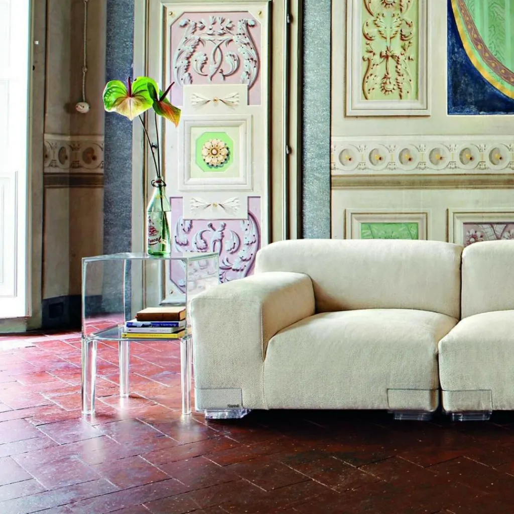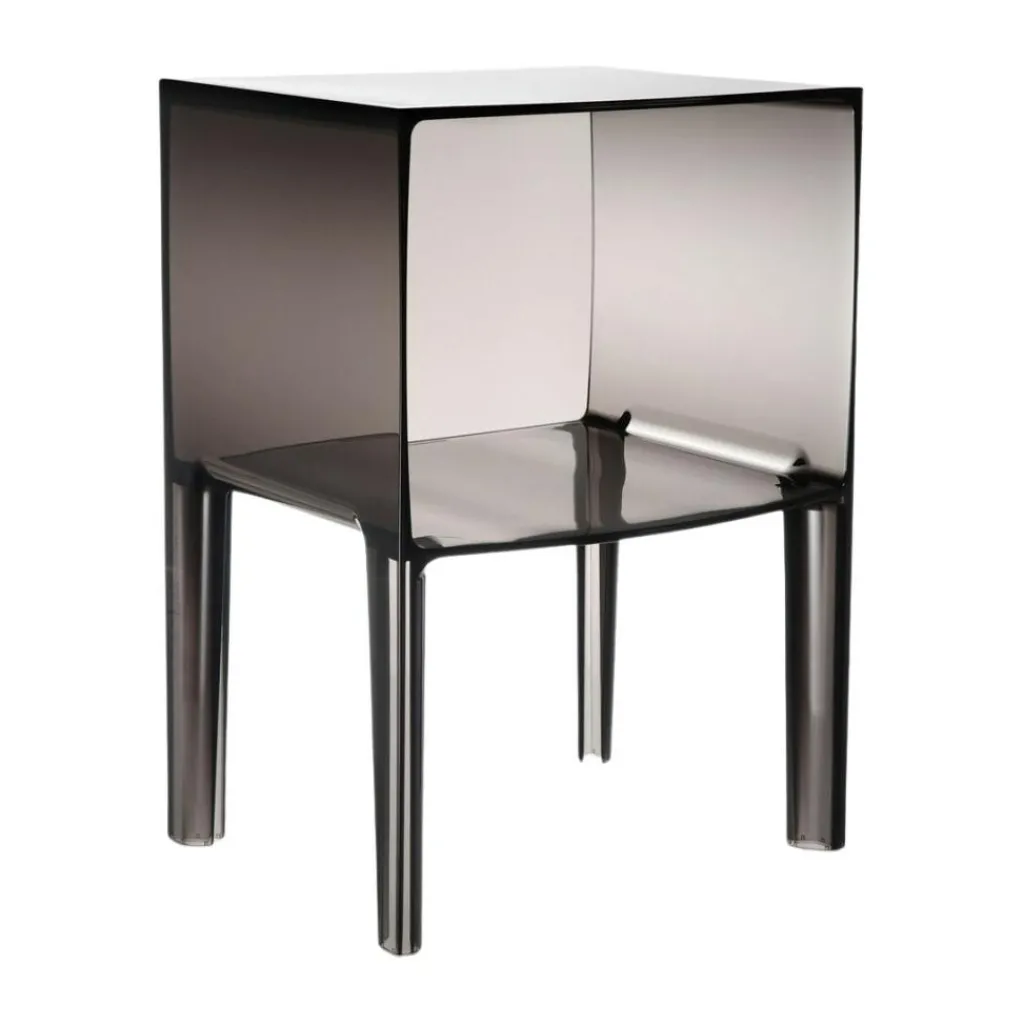 Die äußere Form besticht durch eine minimalistische Geradlinigkeit: ein rechteckiges, an der Vorderseite offenes Kästchen auf vier hohen Beinen. Damit erinnert der Small Ghost Buster Nachttisch an ein klassisches Aufbewahrungsmöbel, das nicht nur neben das Bett, sondern in verschiedene Wohnbereiche oder sogar an den Arbeitsplatz passt. Seine auffällige Optik verdankt es dem Material aus Polymethylmethacrylat, einem besonders leichten Kunststoff, der je nach gewählter Ausführung mehr oder weniger transparent erscheint. In einem Guss gefertigt, zeichnet sich das Designstück durch eine hohe Stabilität und Robustheit aus. Darüber hinaus ist es wasserresistent und kann ebenso im Badezimmer wie unter freiem Himmel stehen. So passt der Small Ghost Buster Nachttisch auch in den Wellnessbereich eines Hotels oder in den Garten.