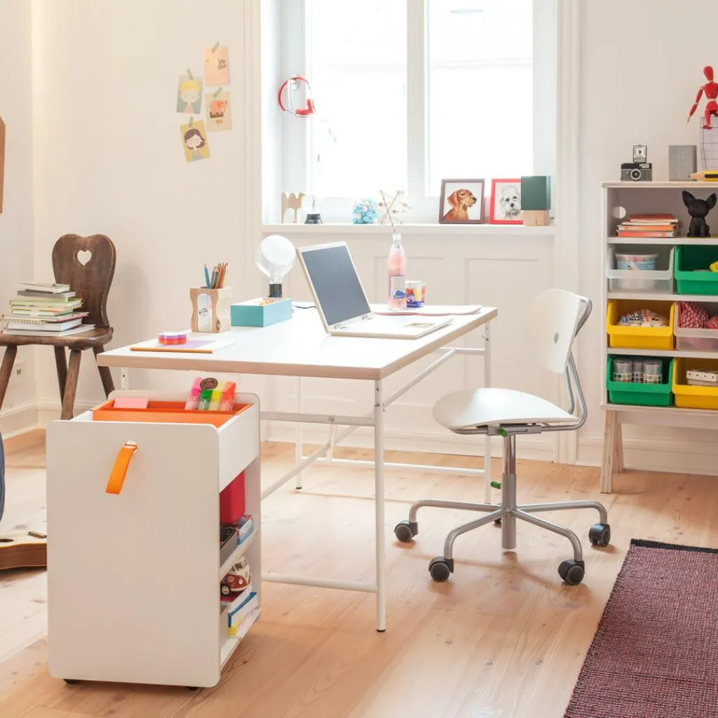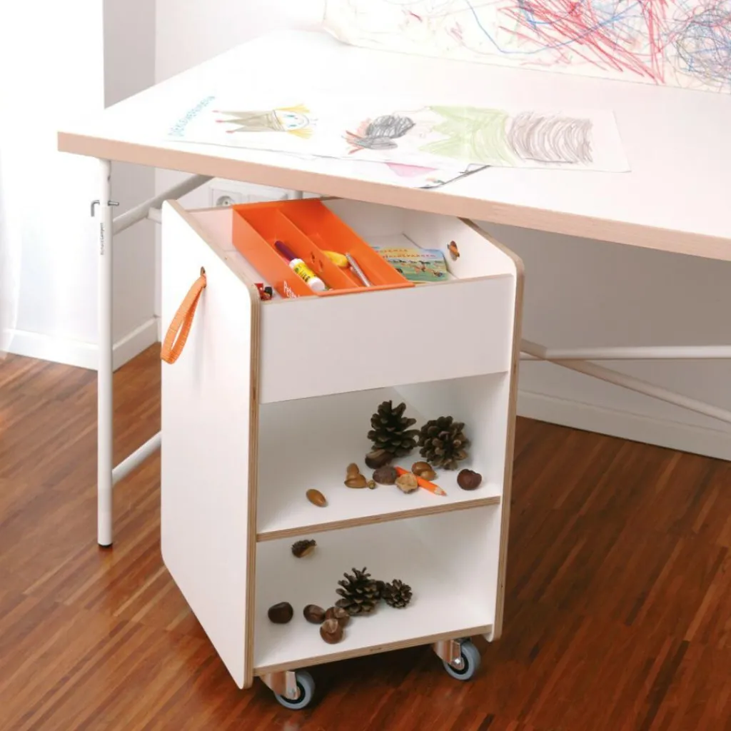 Der Fixx Rollcontainer H 56cm stammt aus der Produktion vom Möbelhersteller Richard Lampert. Für Kinder ist die bewegliche Mini-Kommode ein Ordnungshelfer, der richtig gut aussieht. Mit den Gurten können sie ihn in jede Ecke schieben. Schulbücher und bunte Boxen kommen auf die Ablageflächen. In der verschiebbaren Schale ganz oben liegen Stifte, Kulis, Lineal – also alles, was sie zum Schreiben und Malen brauchen.