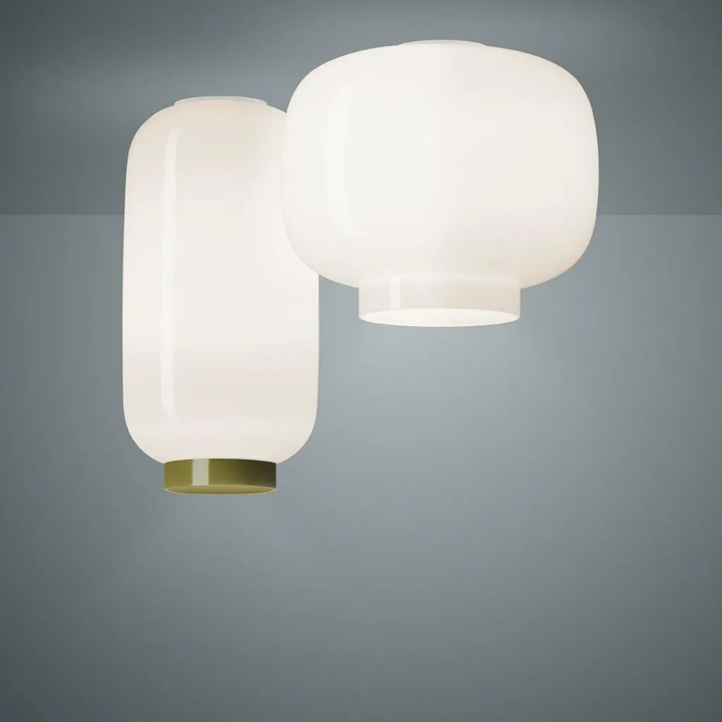 Die Chouchin 2 Reverse Deckenleuchte ist ein schlichtes Modell, das die Form eines Zylinders beschreibt. Die Ecken sind harmonisch gerundet. An der Unterseite zeigt der Leuchtenschirm eine ringförmige Öffnung. Er wird aus lackiertem, mundgeblasenem Glas gemacht. Daraus strahlt Licht in alle Richtungen diffus und auch direkt ab. Die Leuchte wird mit einer Halterung an der Decke befestigt und mit Stahlseilen fixiert. Die Montage des Diffusors ist einfach: Er wird auf die Halterung aufgesetzt und um 120 Grad gedreht. Ein Sicherheitsstift arretiert die Leuchte an der richtigen Position. Man kann die Leuchte mittels TRIAC dimmen.