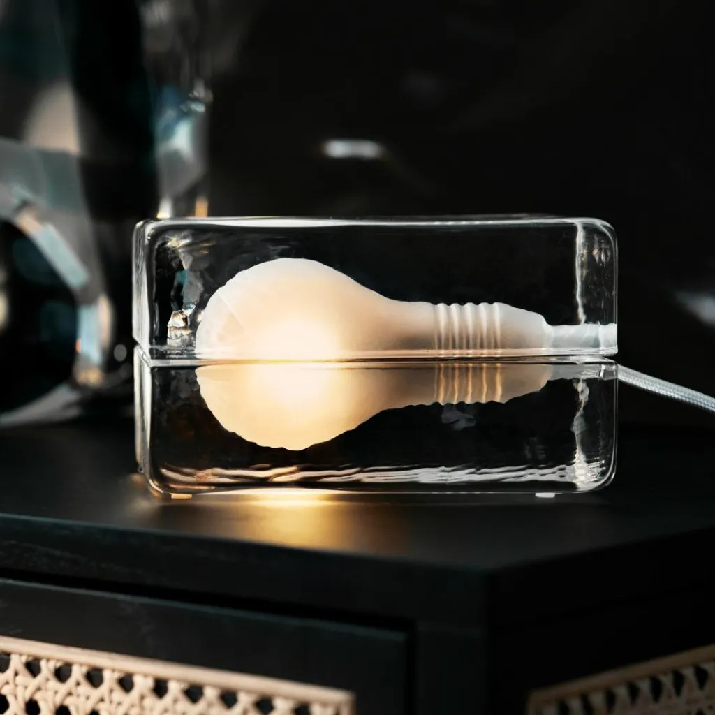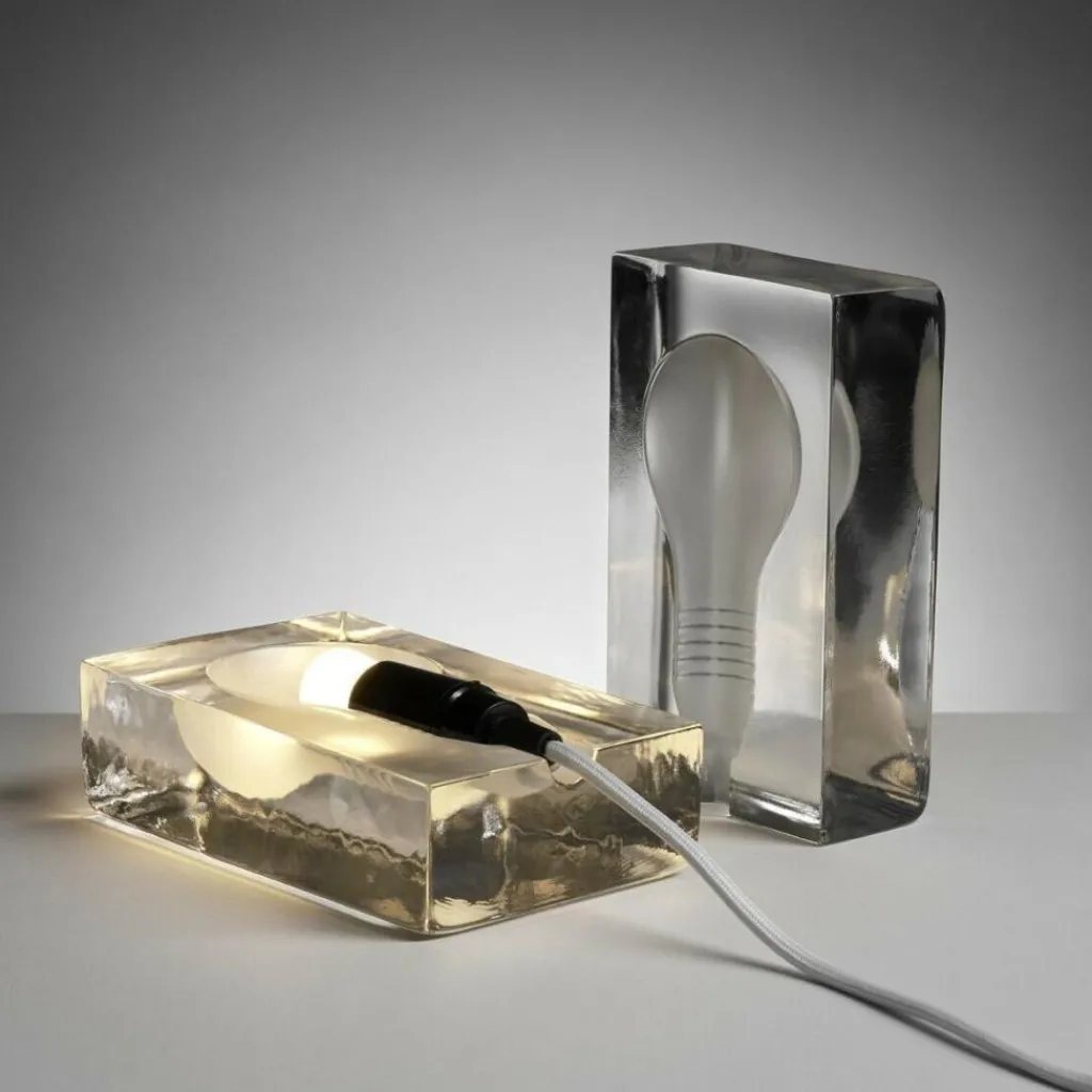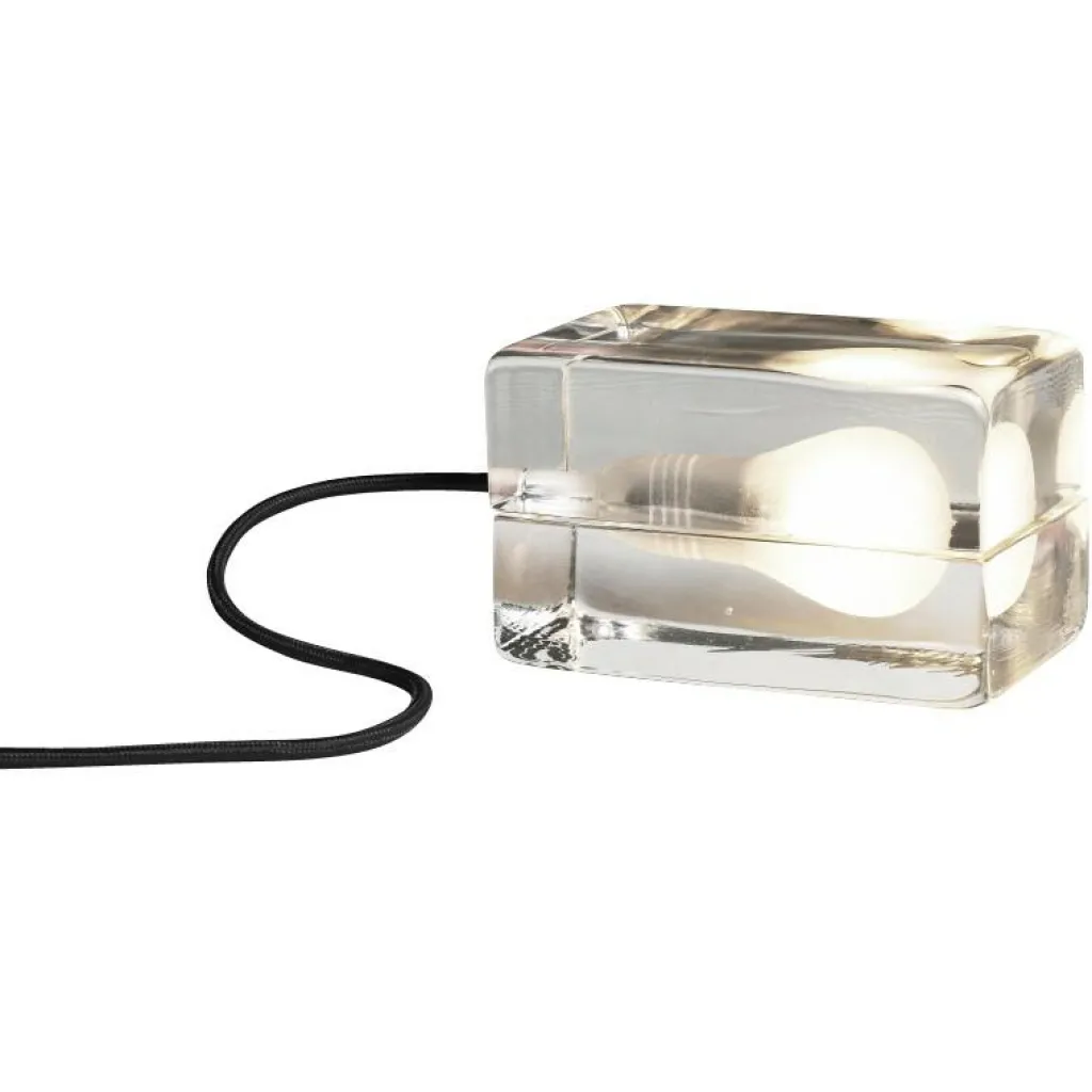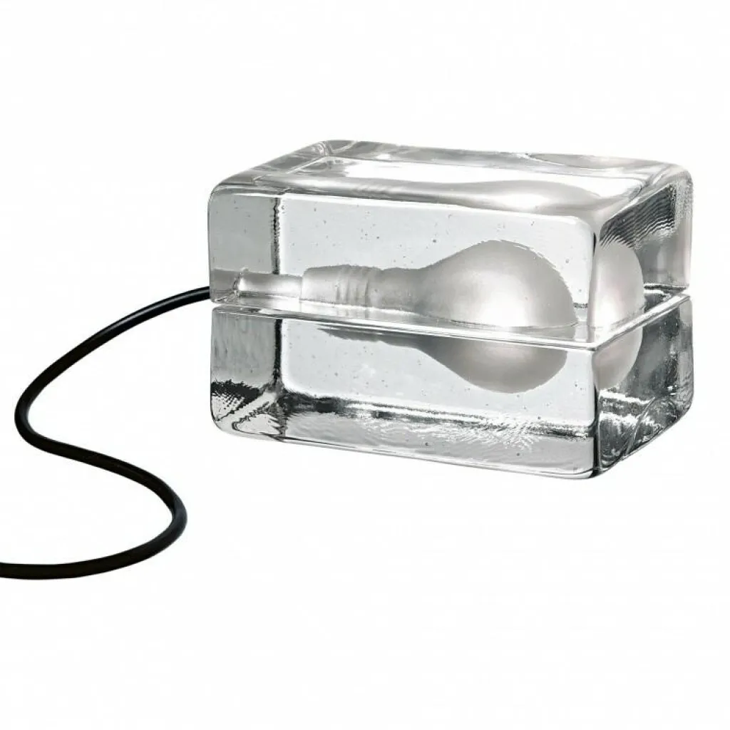 Bestehend aus handgefertigtem und aufwendig verarbeitetem Klarglas sehen Sie hier eine Design Leuchte, die ihrer Optik nach an einen richtigen Eisblock erinnert. Die zwei Glas-Hälften der Block Lamp Tischlampe umgeben das Leuchtmittel und verleihen dem Raum eine angenehme Beleuchtung.