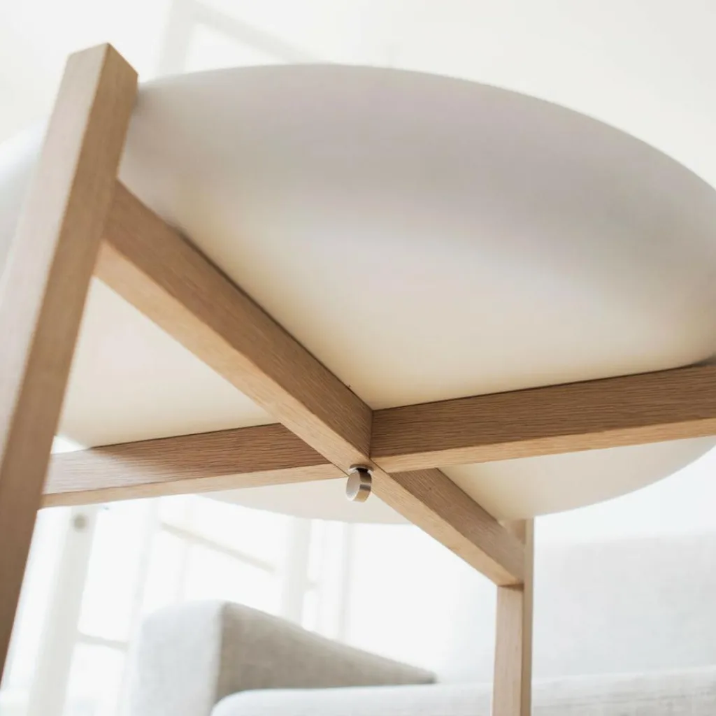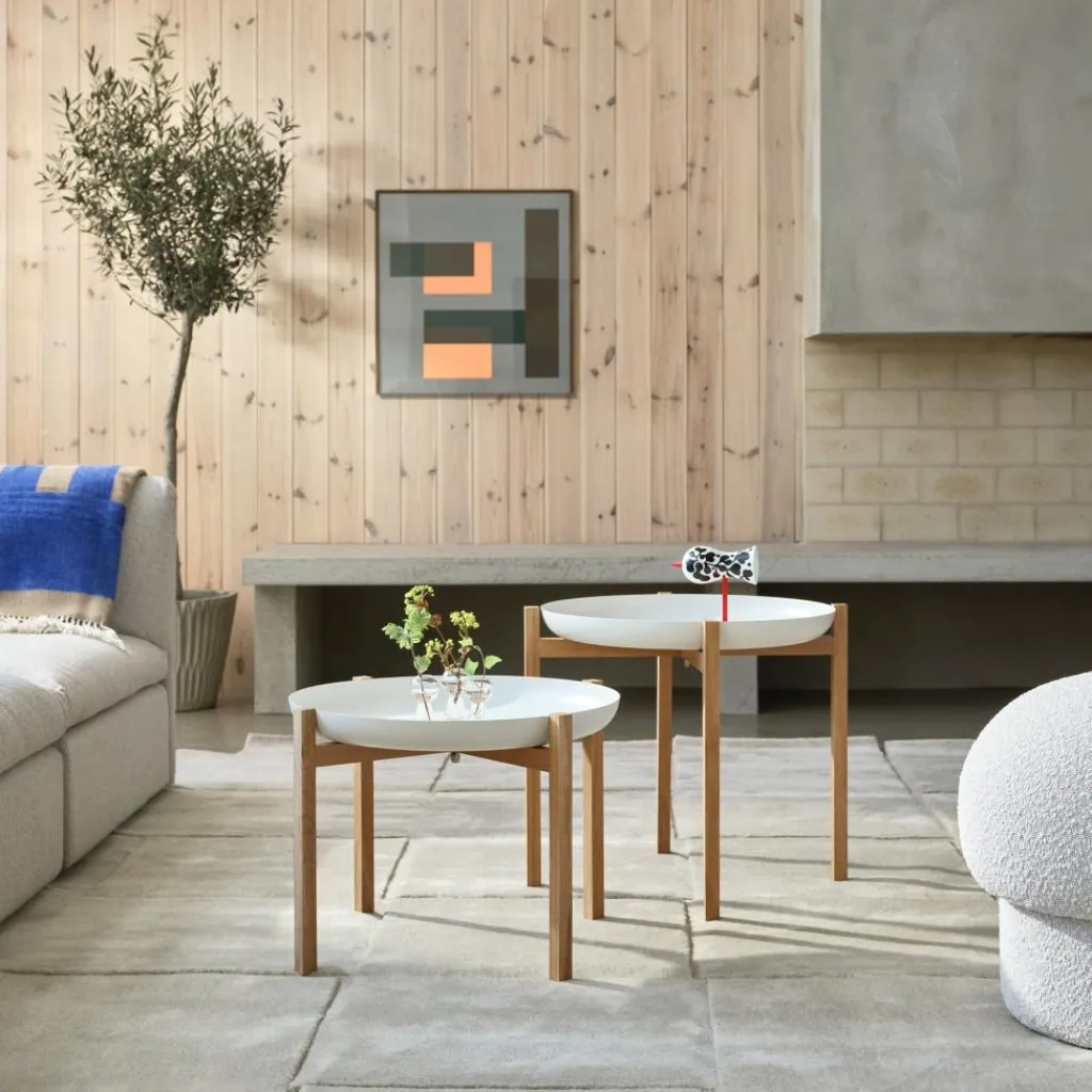 In Anlehnung an seinen Namen ist die Tischplatte des Tablo Beistelltisches H40cm als Besonderheit als praktisches Tablett in runder Form mit einem hochgezogenen Rand gearbeitet. Es liegt auf dem Gestell mit vier Kantholzbeinen und einem mittigen Kreuzgestell auf. Die Enden der vier Beinstreben schließen bündig mit dem Tablettrand ab. So kann das Tablett mit einem Handgriff abgenommen und mit vorbereiteten Snacks und Getränken wieder auf dem Gestell arrangiert werden. Die Tischplatte besteht aus pulverbeschichtetem Stahl. Das Gestell ist aus massivem Eichenholz mit geölter Oberfläche gearbeitet. Der Beistelltisch ist in zwei Höhen verfügbar und kann so als Set kombiniert werden. Das kleinere Modell misst 40cm Höhe bei einem Durchmesser von 59cm und 3,7kg Gewicht. Die größere Variante hat einen Durchmesser von 59cm und ist 50 cm hoch. Das Gewicht ist 3,8kg.