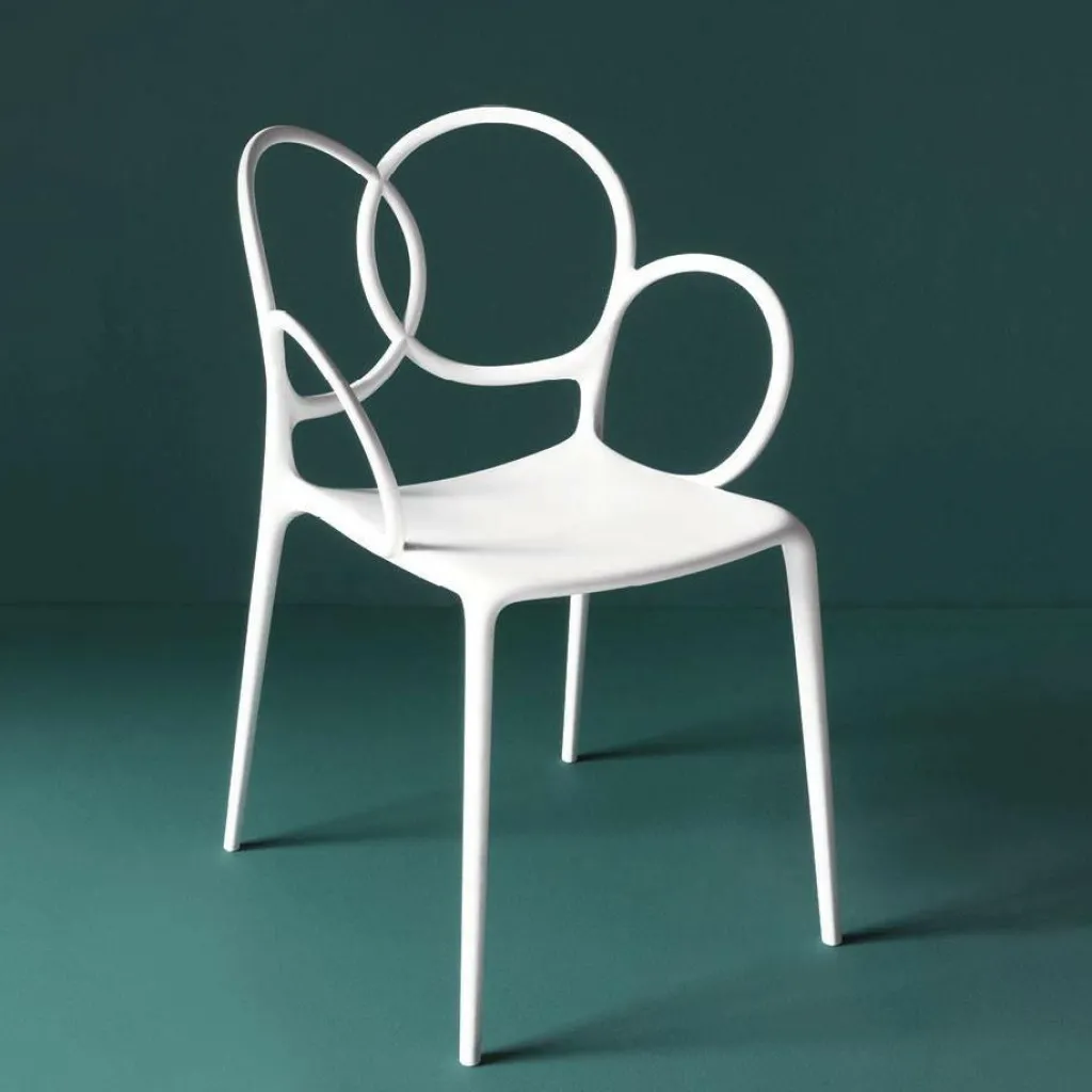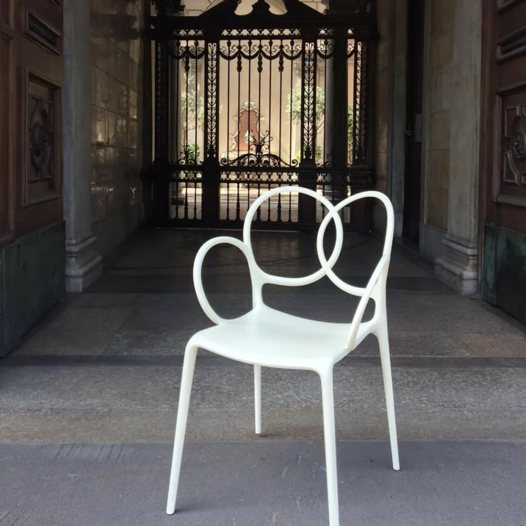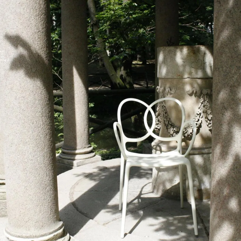 Der Sissy Gartenarmlehnstuhl wurde von Ludovica + Roberto Palomba für die Marke Driade entworfen. Dem Designerduo aus Italien gelingt es perfekt, das Design vergangener Tage in die Gegenwart zu transportieren. Wie bei jedem Objekt der beiden Künstler entwarfen sie den Sissi Gartenlehnstuhl mit dem Ziel, ein Wohlfühlmöbel für seinen Besitzer zu kreieren. Der Sissi Gartenlehnstuhl lässt die alte K.-u-k.-Monarchie Österreichs wieder aufleben. Das verspielte Möbel hätte sich in den mondänen Wohnstätten der Kaiserin Elisabeth, die ihre Fans heute noch liebevoll Sissi nennen, sicher gut ausgenommen. Angelehnt an die lange österreichische Möbeltradition präsentiert sich der Sissi Gartenarmlehnstuhl in verspieltem Design. Die Rückenlehne besteht aus kunstvoll geschwungenen Stäben, die durch Fiberglas verstärkt wurden. Die abgerundeten Kanten verleihen der Sitzgelegenheit ein stilvolles Aussehen. Der Sissi Gartenarmlehnstuhl punktet nicht nur mit seiner eleganten Optik, sondern auch mit seiner Vielseitigkeit. Da er aus robustem Kunststoff gefertigt ist, kann er auch im Outdoorbereich eingesetzt werden. Im Garten oder auf der Terrasse macht er eine ebenso gute Figur wie im Wohn- oder Esszimmer. Auch in Wartezimmern, in Hotellobbys oder Gastronomiebetrieben sorgt er für stilvolles Ambiente. Praktisch ist außerdem, dass sich der Sissi Gartenarmlehnstuhl bequem stapeln lässt und dank seines geringen Gewichts an jedem beliebigen Ort platziert werden kann.