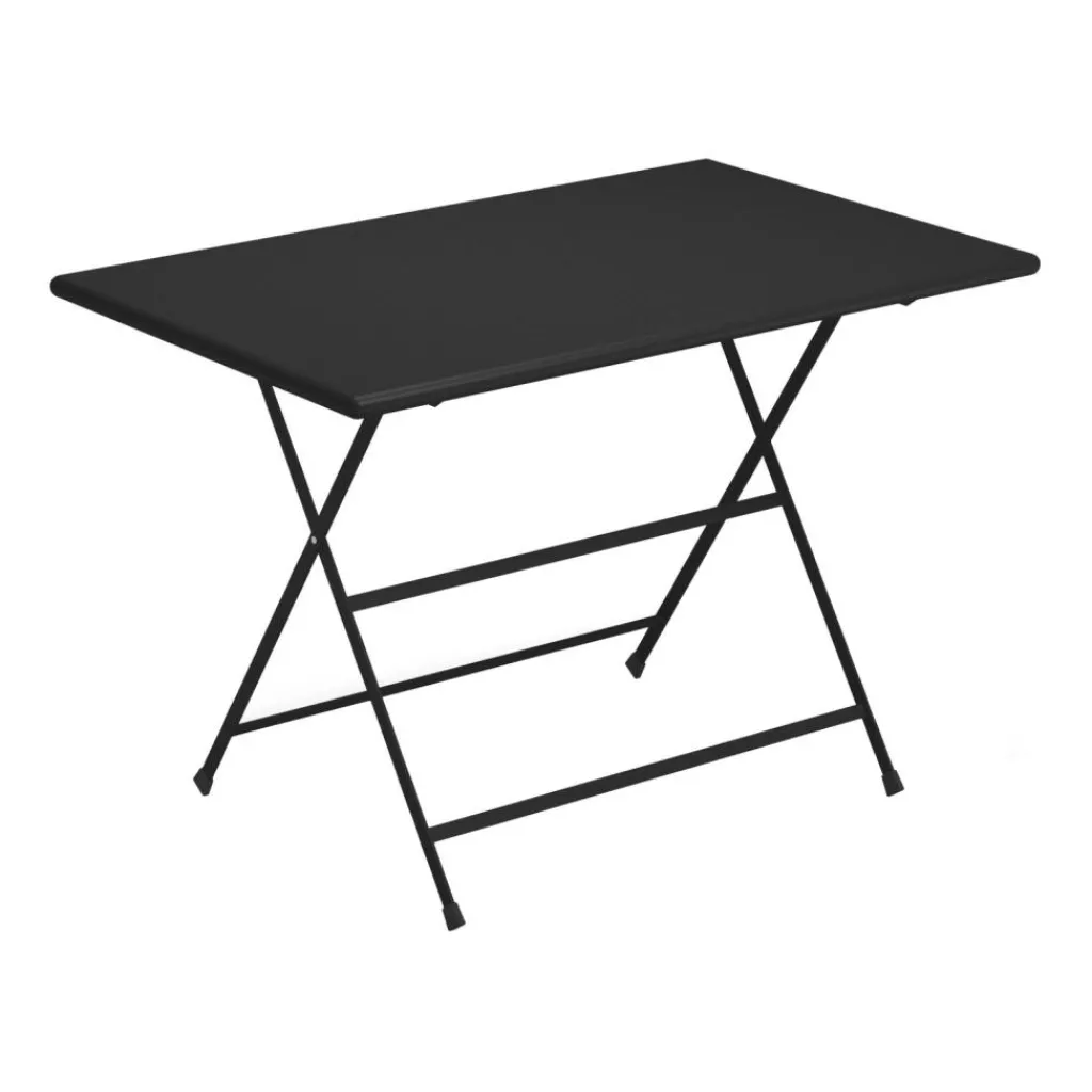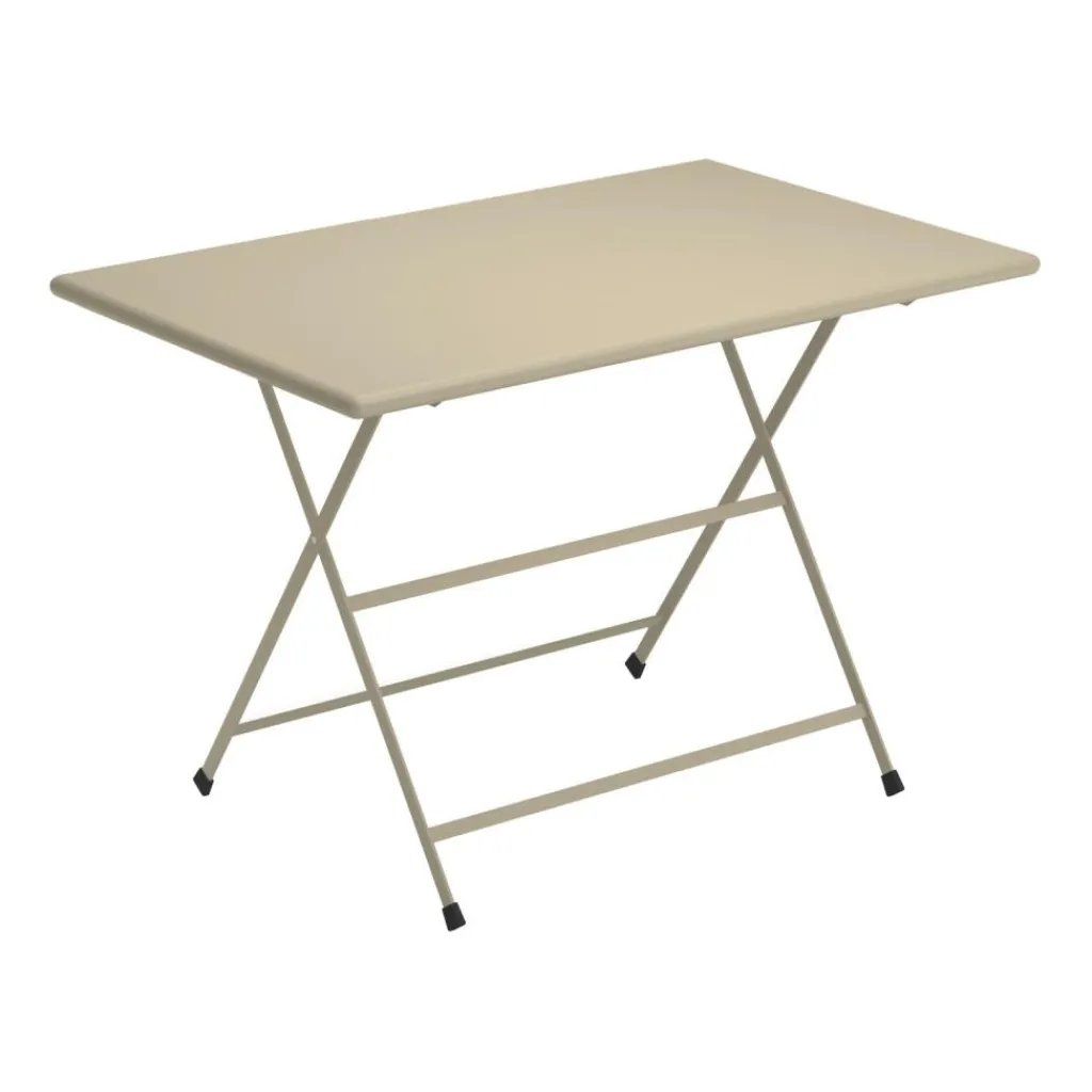 Ein klassisches, gekreuztes Gestell sichert dem Arc en Ciel Gartenesstisch klappbar 110x70cm festen Stand. Wird das Gestell an der Unterseite der Tischplatte entsperrt, kann man den Tisch zusammenklappen. So passt er auch in schmale Nischen im Gartenhaus, in der Garage oder im Keller. Der Arc en Ciel Gartenesstisch klappbar 110x70cm wird mit Gleitern geliefert, die heikle Böden schonen. Die rechteckige Tischplatte bietet eine große Abstellfläche für alles, was man an einem entspannten Tag im Garten, auf der Terrasse oder Balkon benötigt. Der Arc en Ciel Gartenesstisch klappbar 110x70cm wird aus Stahl gemacht. Es wird ein Korrosionsschutz aufgetragen. Dadurch machen dem Modell Witterungseinflüsse nicht viel aus.