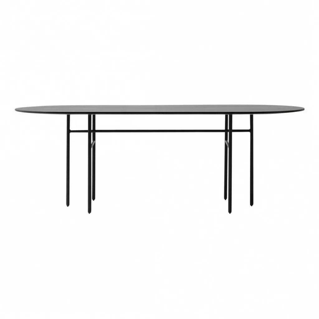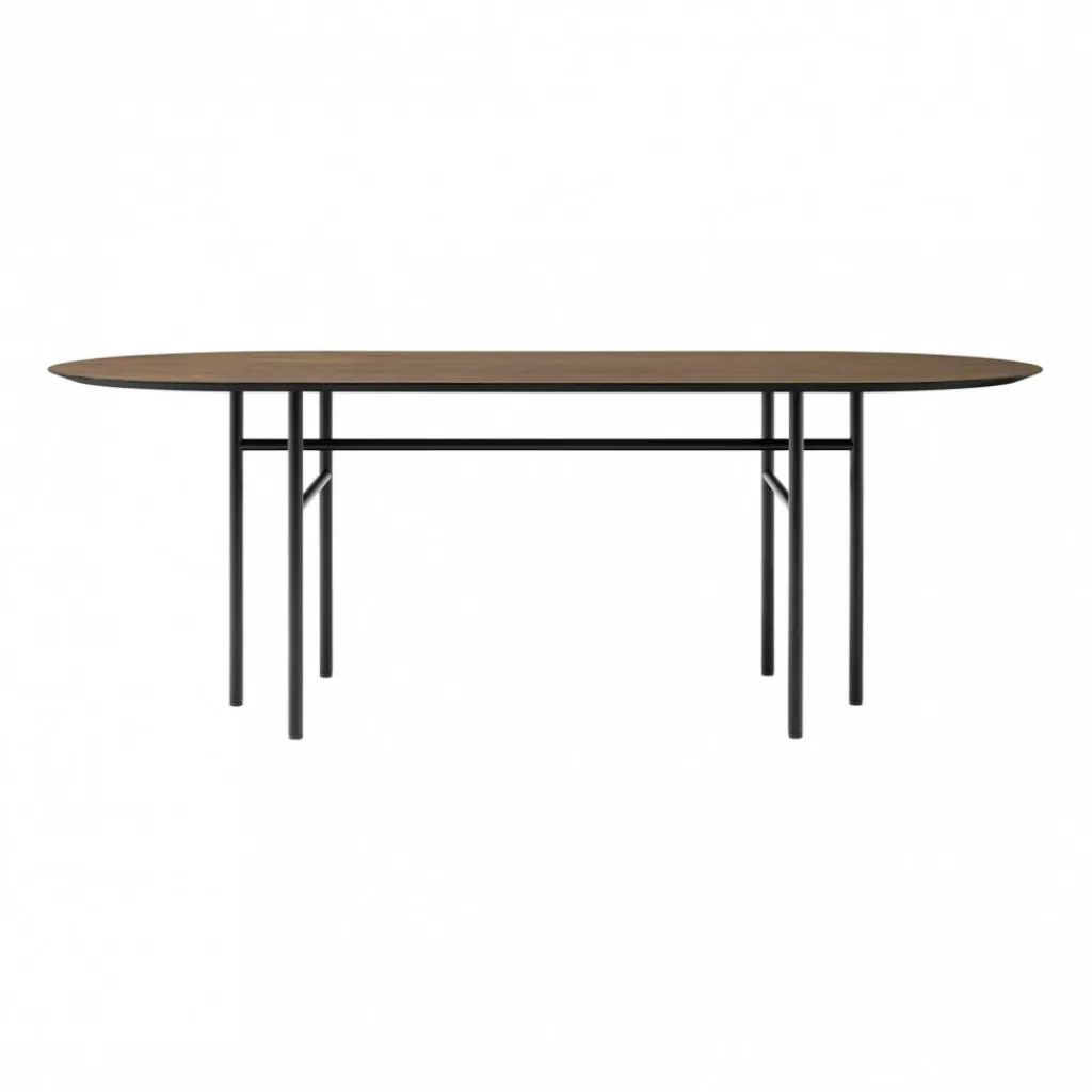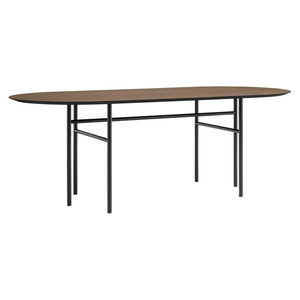 Der Snaregade Esstisch oval ist nach jener Straße benannt, in der viele der innovativen Designer von Norm Architects ihr Studio haben. Zum Blickfang wird das Gestell aus pulverbeschichtetem Stahl. Es besteht aus sechs rohrförmigen Beinen, die sich nach unten hin deutlich verjüngen. Jeweils zwei Beine sind mit einer Längs- oder Querstrebe miteinander verbunden. Die ovale Tischplatte besteht aus Eichenholz und ist in verschiedenen Farben zu haben. Heute sind die Tische der Snaregade-Kollektion, die Modelle in verschiedenen Größen umfassen, nicht nur im privaten Umfeld zu finden. Der Snaregade Esstisch oval kann auch als Konferenztisch eingesetzt werden. Auch in eleganten Restaurants wird der Snaregade Esstisch oval gerne verwendet.